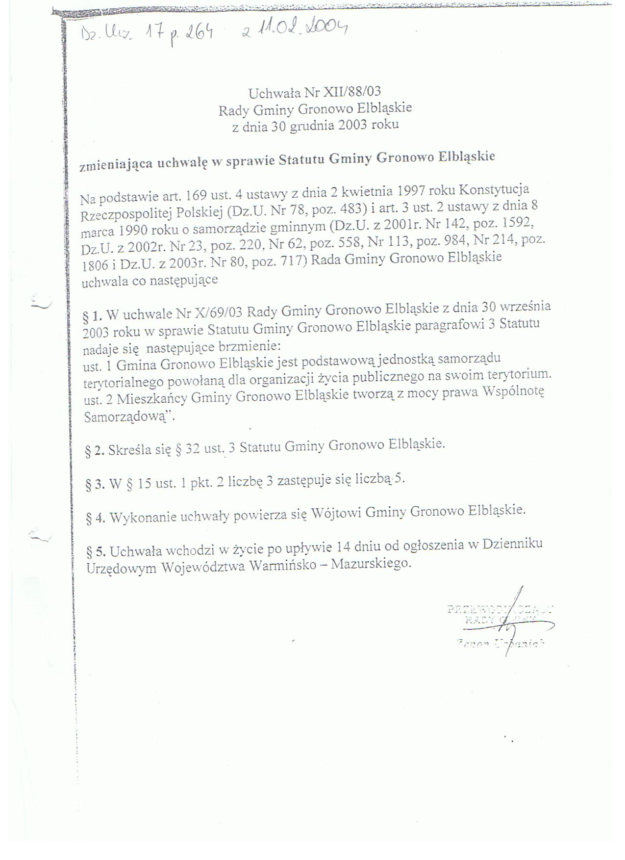 - Uchwała nr XII/88/03 Rady Gminy Gronowo Elbląskie z dnia 30 grudnia 2003 roku zmieniająca uchwałę w sprawie Statutu Gminy Gronowo Elbląskie