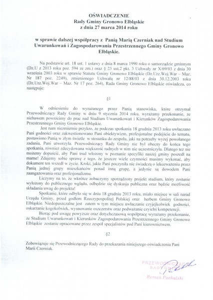 Oświadczenie Rady Gminy Gronowo Elbląskie z dnia 27 marca 2014r. w sprawie dalszej współpracy z Panią Marią Czerniak nad Studium Uwarunkowań i Zagospodarowania Przestrzennego Gminy Gronowo Elbląskie