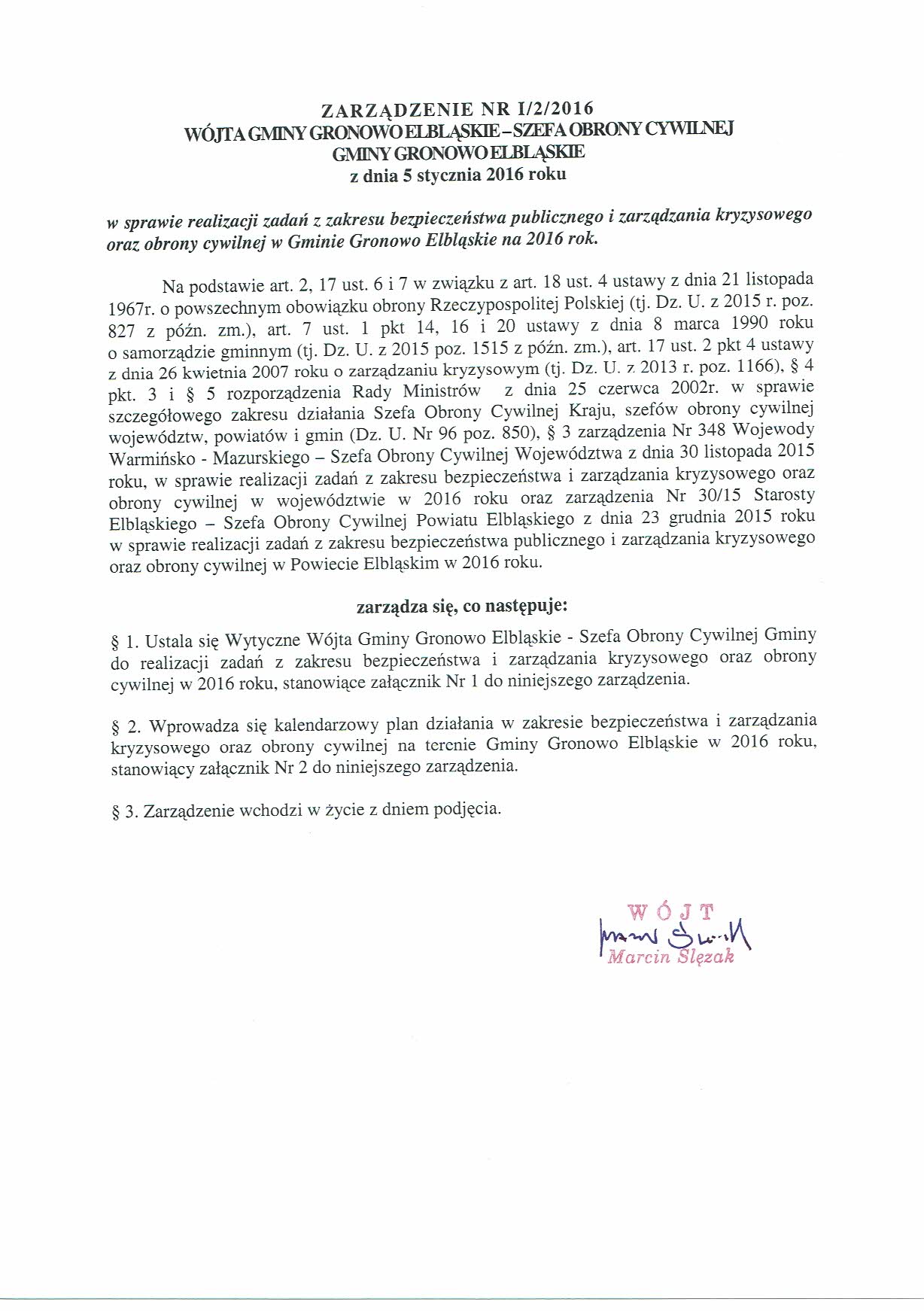 Zarządzenie Nr I/2/2016 Wójta Gminy Gronowo Elbląskie z dnia 5 stycznia 2016 roku w sprawie realizacji zadań z zakresu bezpieczeństwa publicznego i zarządzania kryzysowego oraz obrony cywilnej w Gminie Gronowo Elbląskie na 2016 rok