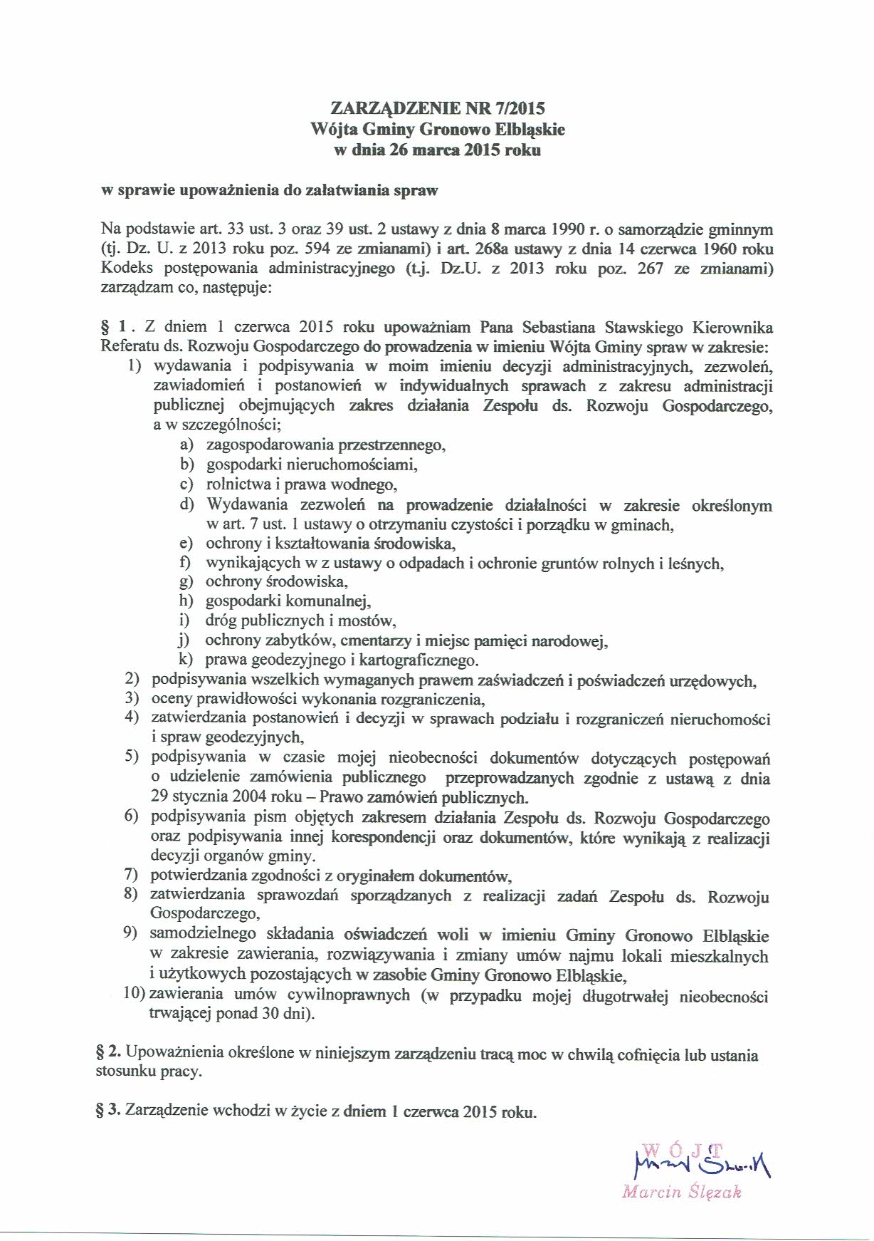 Zarządzenie Nr 7/2015 Wójta Gminy Gronowo Elbląskie z dnia 26 marca 2015 roku w sprawie udzielenia upoważnienia do załatwiania spraw