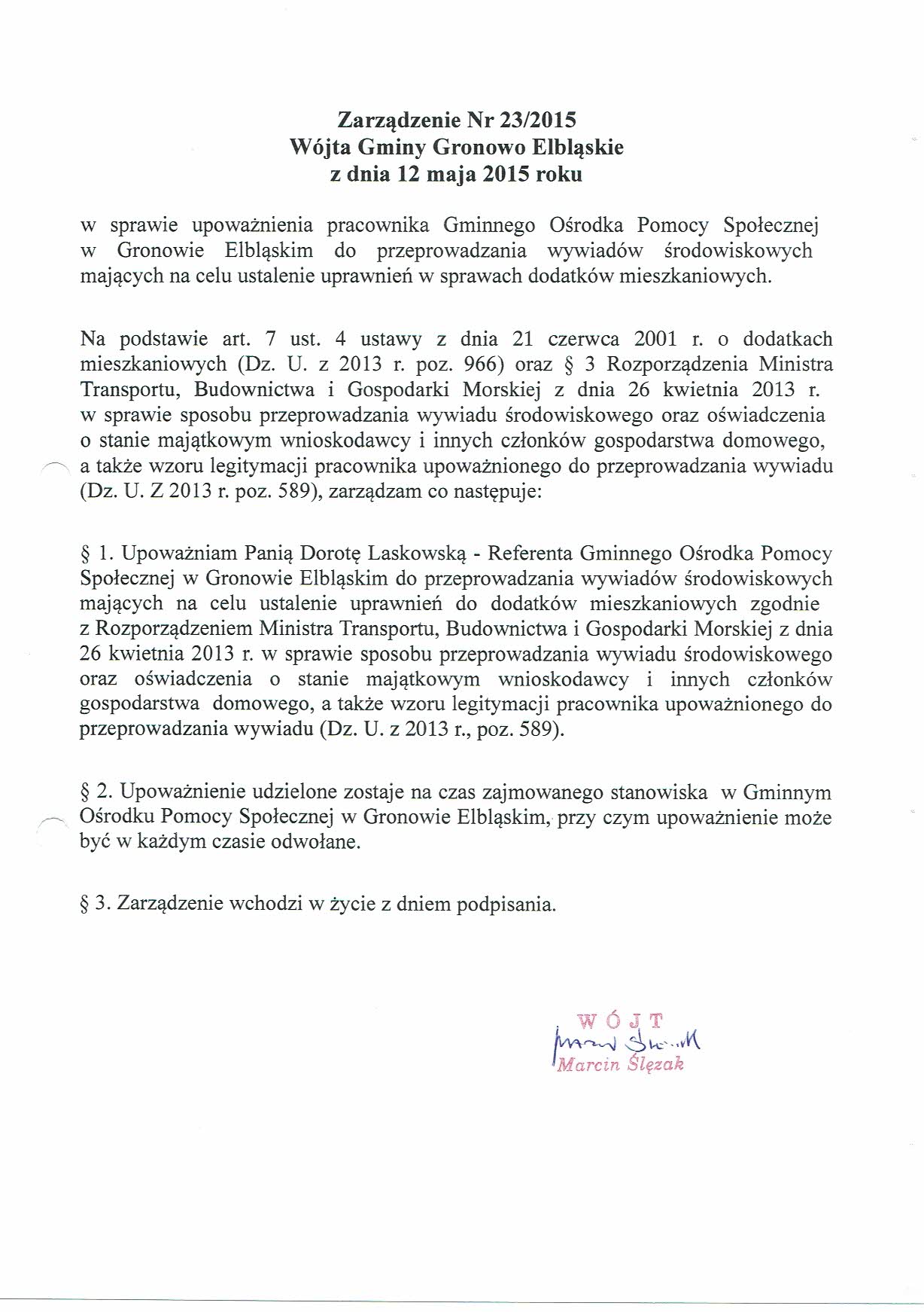 Zarządzenie Nr 23/2015 Wójta Gminy Gronowo Elbląskie z dnia 12 maja 2015 roku w sprawie upoważnienia pracownika Gminnego Ośrodka Pomocy Społecznej w Gronowie Elbląskim do przeprowadzenia wywiadów środowiskowych mających na celu ustalenie uprawnień w sprawach dodatków mieszkaniowych