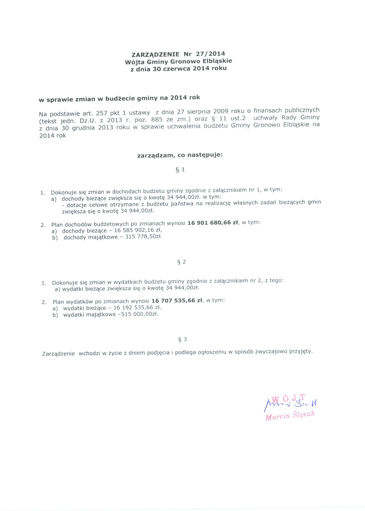 Zarządzenie Nr 27/2014 Wójta Gminy Gronowo Elbląskie z dnia 30 czerwca 2014 roku w sprawie zmian w budżecie gminy na 2014r.