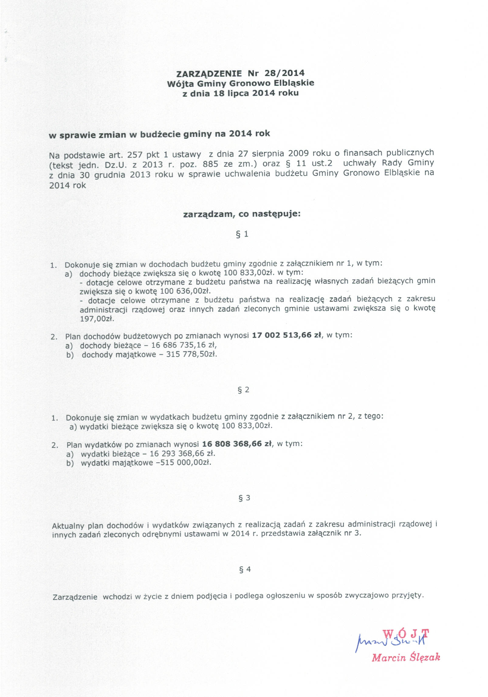 Zarządzenie Nr 28/2014 Wójta Gminy Gronowo Elbląskie z dnia 18 lipca 2014 roku w sprawie zmian w budżecie gminy na 2014r.