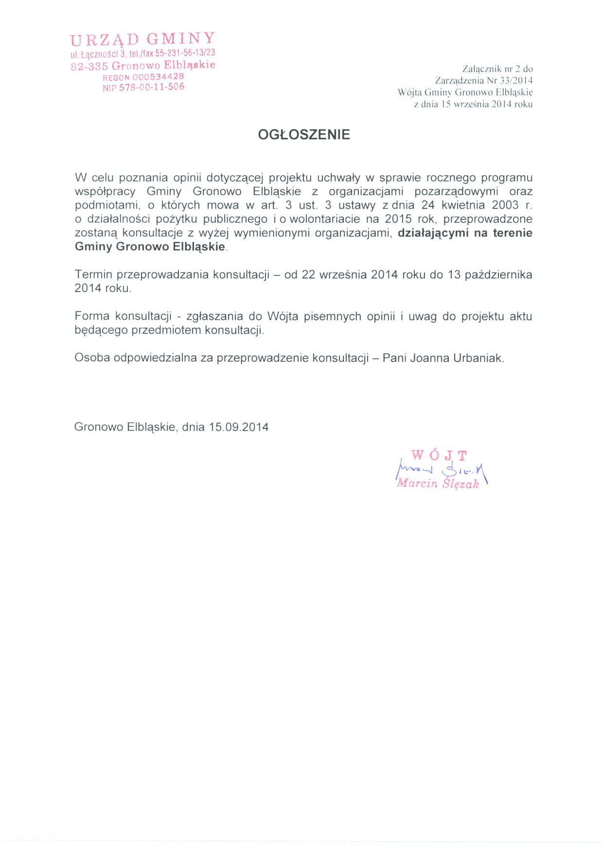 Zarządzenie Nr 33/2014 Wójta Gminy Gronowo Elbląskie z dnia 15 września 2014 roku w sprawie ogłoszenia konsultacji społecznych dot. przyjęcia projektu PROGRAMU WSPÓŁPRACY GMINY GRONOWO ELBLĄSKIE Z ORGANIZACJAMI POZARZĄDOWYMI NA 2015 ROK.