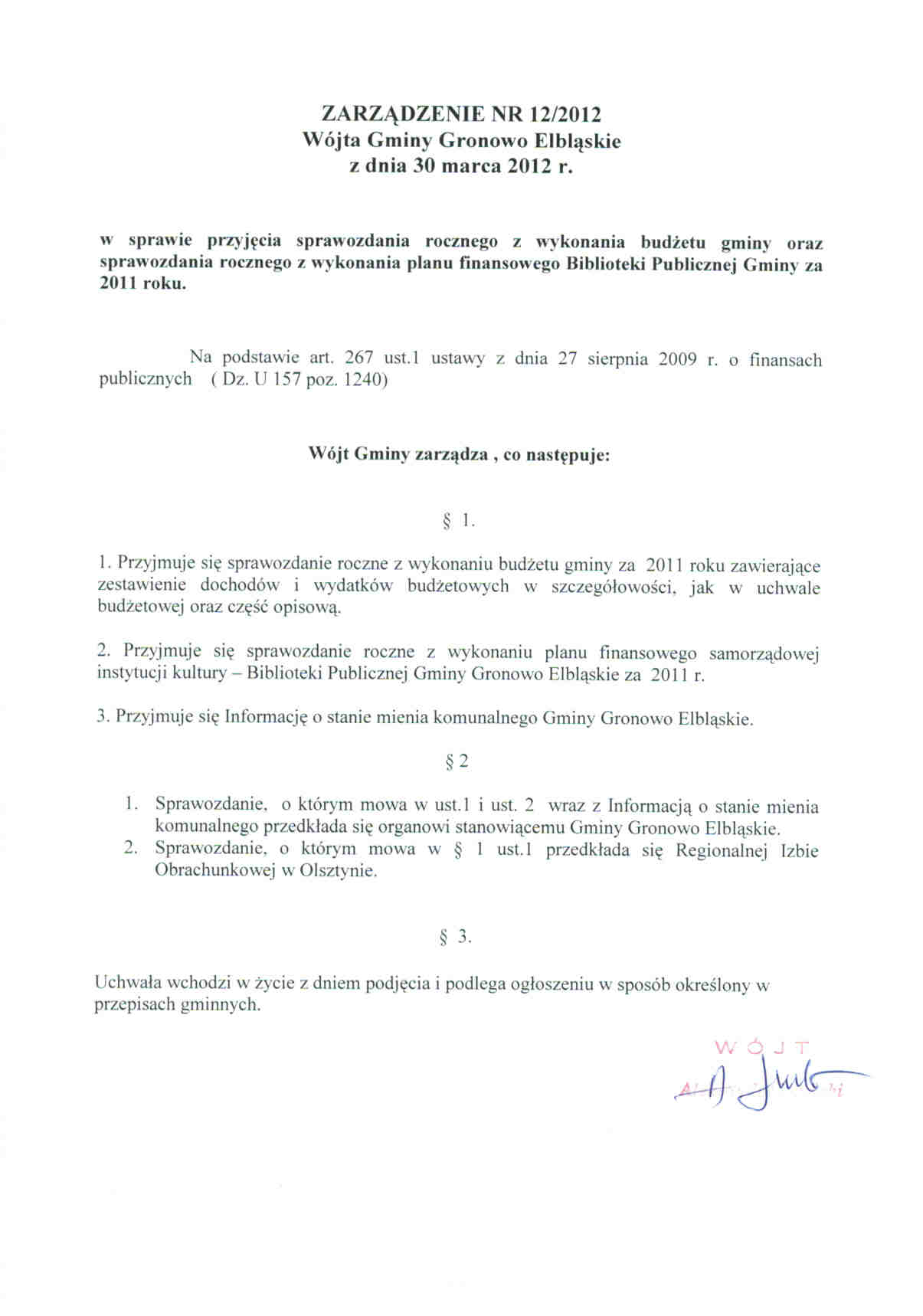 Zarządzenie Nr 12/12 Wójta Gminy Gronowo Elbląskie z dnia 30 marca 2012 roku w sprawie przyjęcia sprawozdania rocznego z wykonania budżetu gminy oraz sprawozdania rocznego z wykonania planu finansowego Biblioteki Publicznej Gminy za 2011 rok