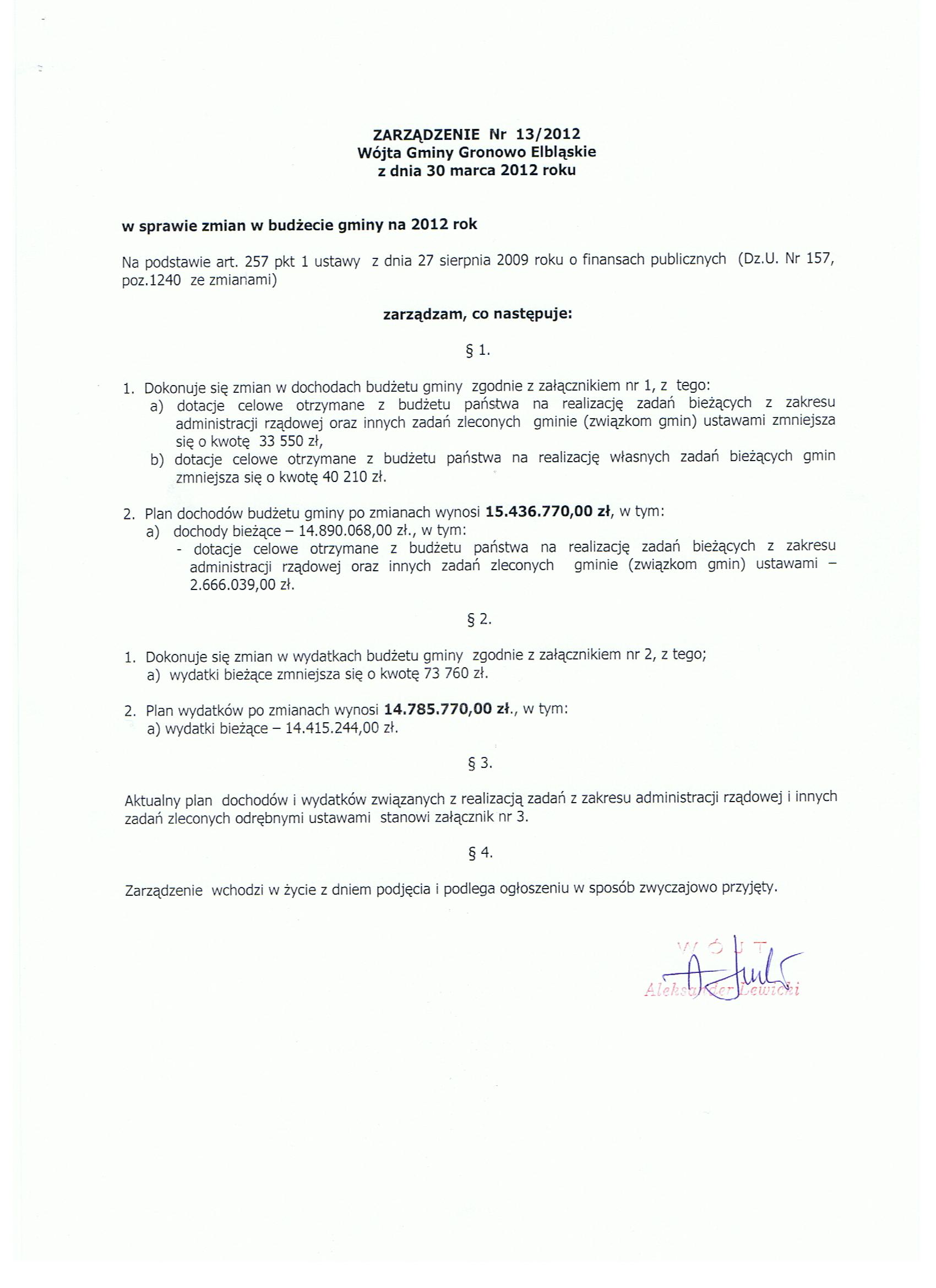 Zarządzenie Nr 13/12 Wójta Gminy Gronowo Elbląskie z dnia 30 marca 2012 roku w sprawie zmian w budżecie gminy na 2012 rok