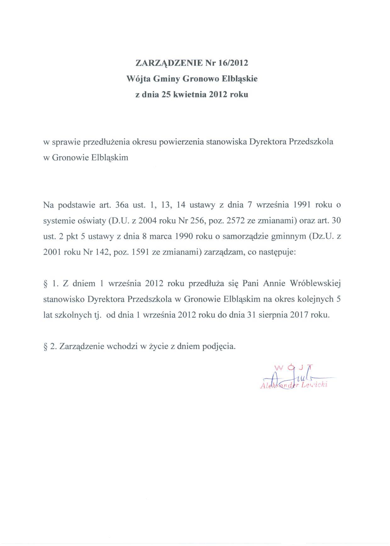Zarządzenie Nr 16/12 Wójta Gminy Gronowo Elbląskie z dnia 25 kwietnia 2012 roku w sprawie przedłużenia okresu powierzenia stanowiska Dyrektora Przedszkola w Gronowie Elbląskim