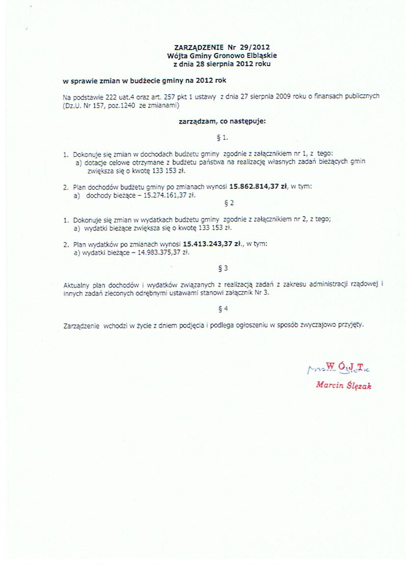 Zarządzenie Nr 29/2012 Wójta Gminy Gronowo Elbląskie z dnia 28 sierpnia 2012 roku w sprawie zmian w budżecie gminy na 2012 rok