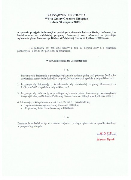 Zarządzenie Nr 31/2012 Wójta Gminy Gronowo Elbląskie z dnia 30 sierpnia 2012 roku w sprawie przyjęcia informacji o przebiegu wykonania budżetu Gminy, informacji o kształtowaniu się wieloletniej prognozy finansowej oraz informacji o przebiegu wykonania planu finansowego Biblioteki Publicznej za I półrocze 2012 roku.