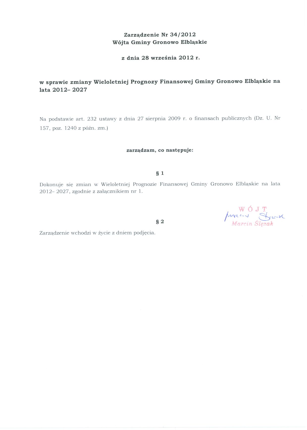 Zarządzenie Nr 34/2012 Wójta Gminy Gronowo Elbląskie z dnia 28 września 2012 roku w sprawie zmiany Wieloletniej Prognozy Finansowej Gminy Gronowo Elbląskie na lata 2012-2027