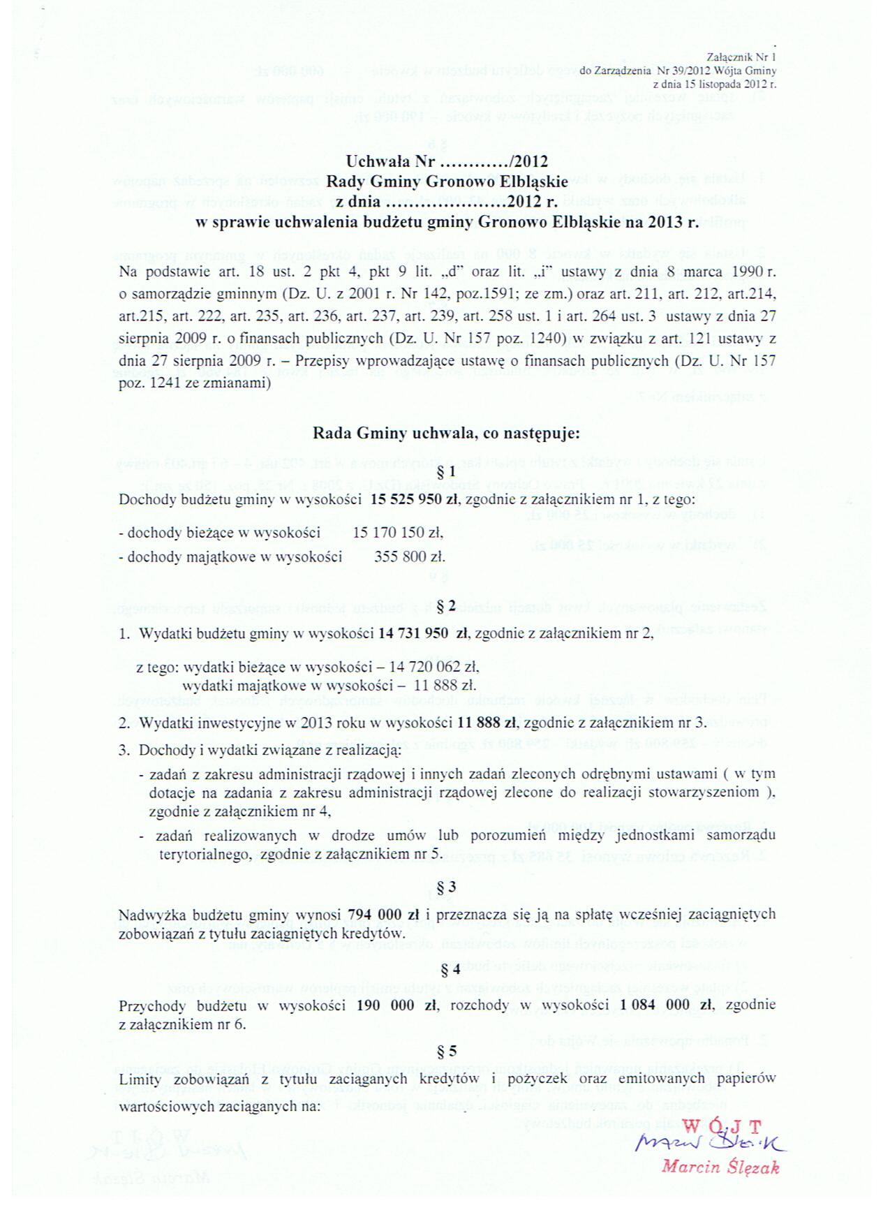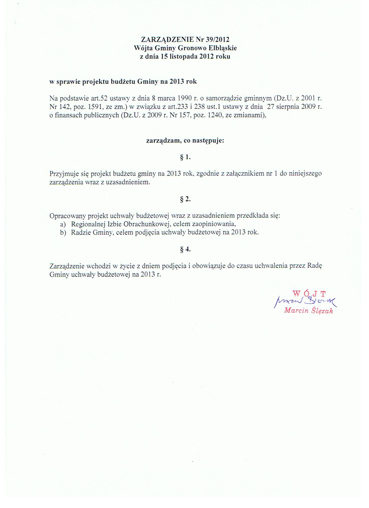 Zarządzenie Nr 39/2012 Wójta Gminy Gronowo Elbląskie z dnia 15 listopada 2012 roku w sprawie projektu budżetu Gminy na 2013 rok