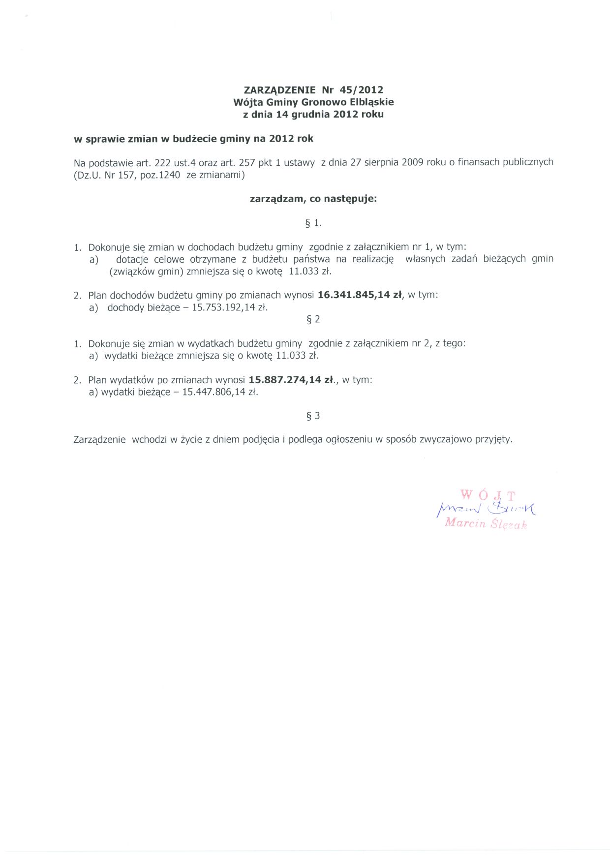 Zarządzenie Nr 45/2012 Wójta Gminy Gronowo Elbląskie z dnia 14 grudnia 2012 roku w sprawie zmian w budżecie gminy na 2012 rok