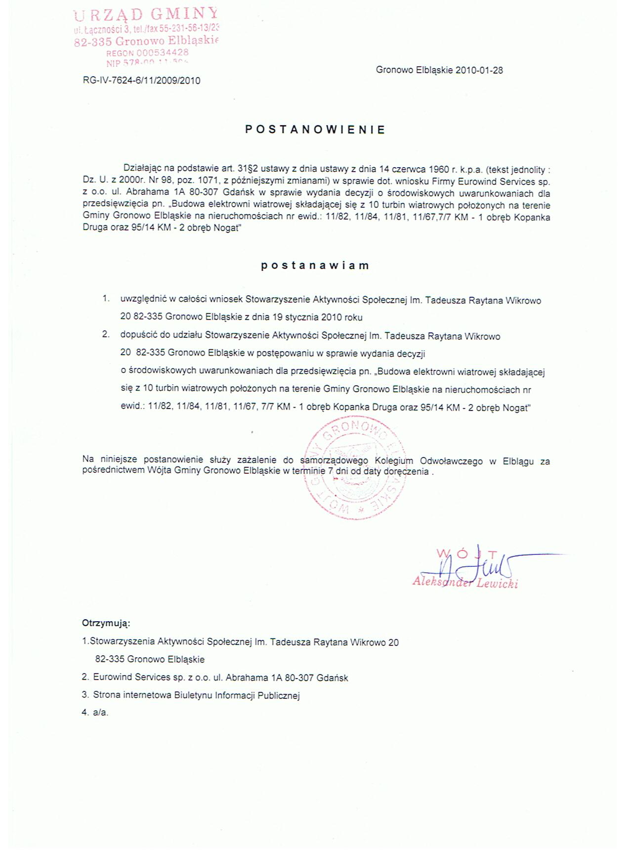 Postanowienie dotyczące Firmy Eourowind w sprawie wydania decyzji o środowiskowych uwarunkowaniach dla przedsięwzięcia pn. "Budowa elektrowni wiatrowej składającej się z 10 turbin wiatrowych położonych na terenie Gminy Gronowo Elbląskie"