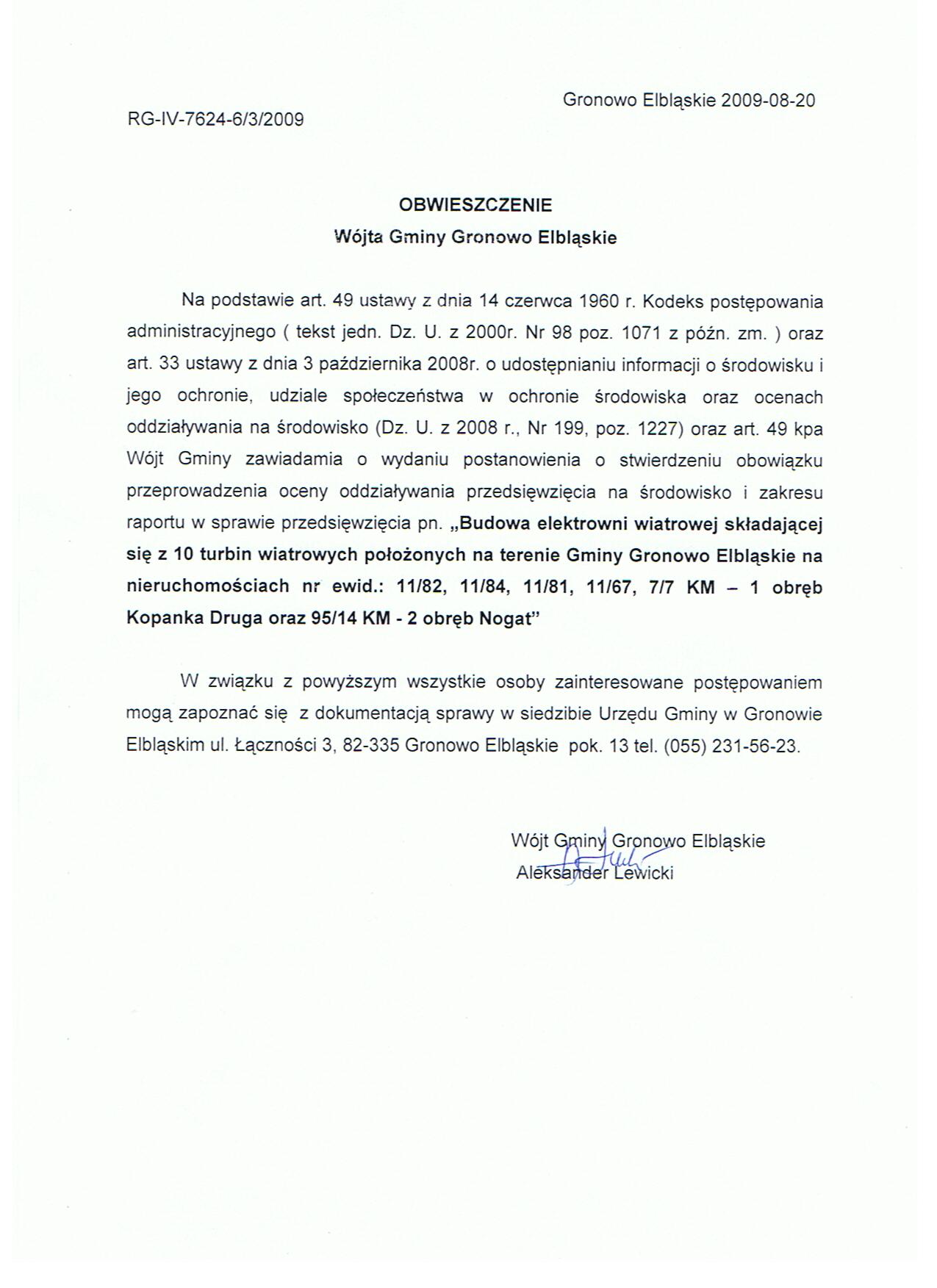 Wersja obowiązująca z dnia 10-05-2016 12:32:21 Drukuj Obwieszczenie Wójta z dnia 20.08.2009 w sprawie budowy elektrowni wiatrowych Załączniki Obwieszczenie Wójta - elektrownie wiatrowe_26.06.2009 format: image/jpeg, rozmiar: 162.64 KB, data dodania: 10-05-2016 12:32:21