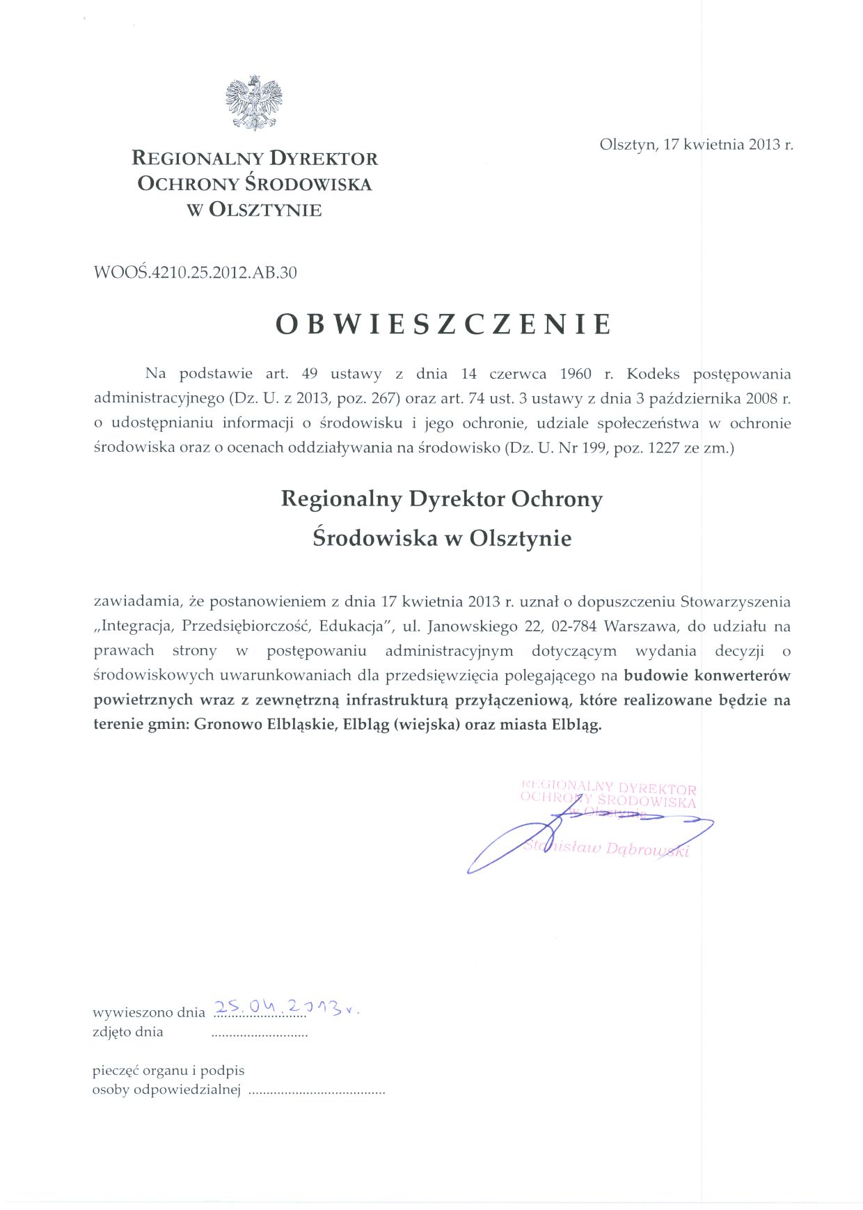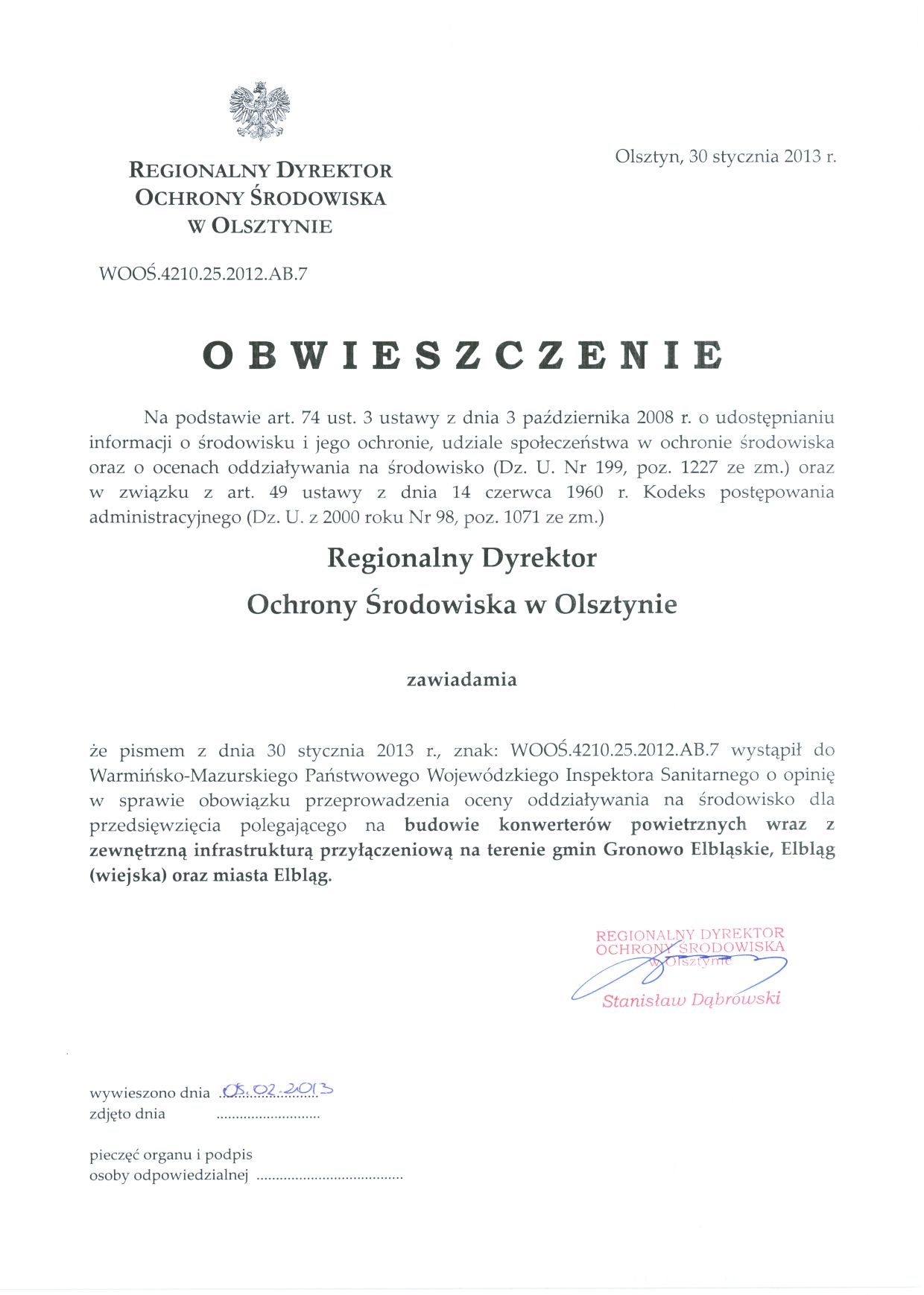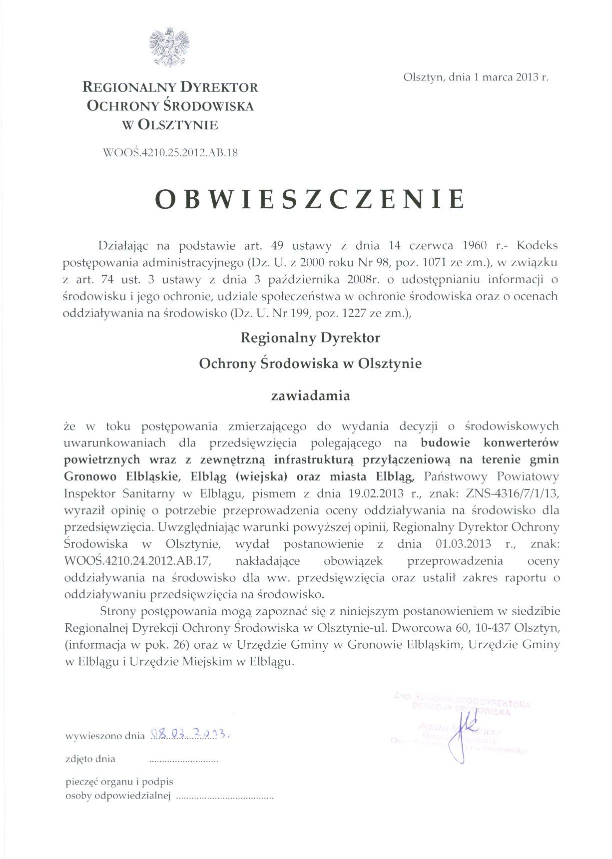 Obwieszczenie Regionalnego Dyrektora Ochrony Środowiska w Olsztynie o wszczęciu postępowania dot. wydania decyzji o środowiskowych uwarunkowaniach dla przedsięwzięcia polegającego na "budowie konwerterów powietrznych wraz z zewnętrzną infrastrukturą przyłączeniową na terenie gminy Gronowo Elbląskie, Elbląg (wiejska) oraz miasta Elbląg"