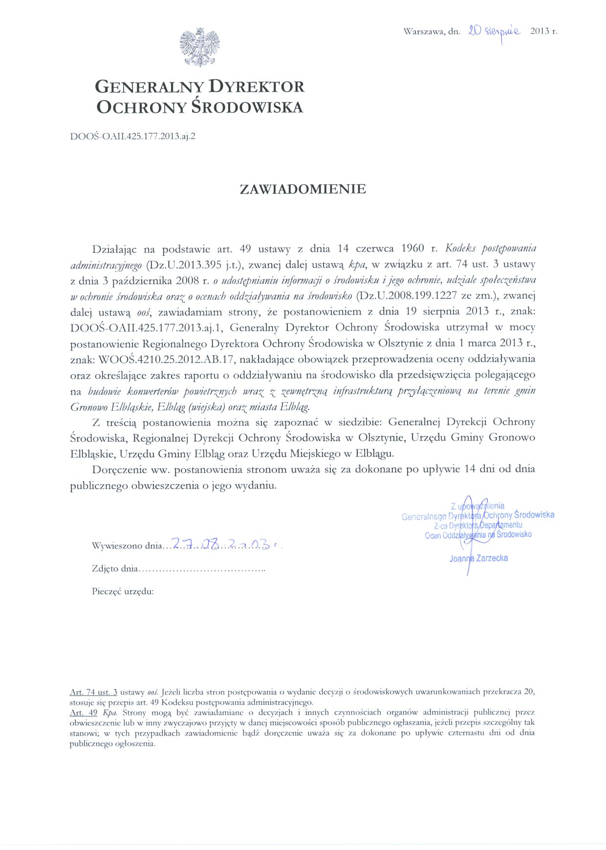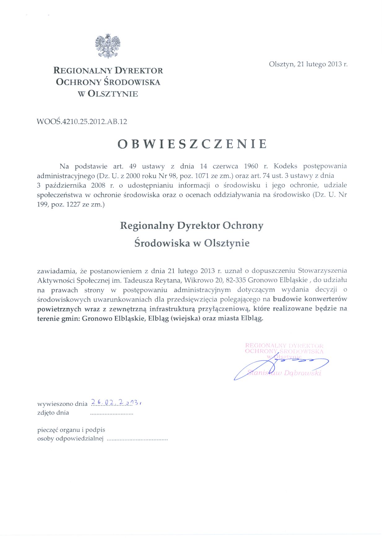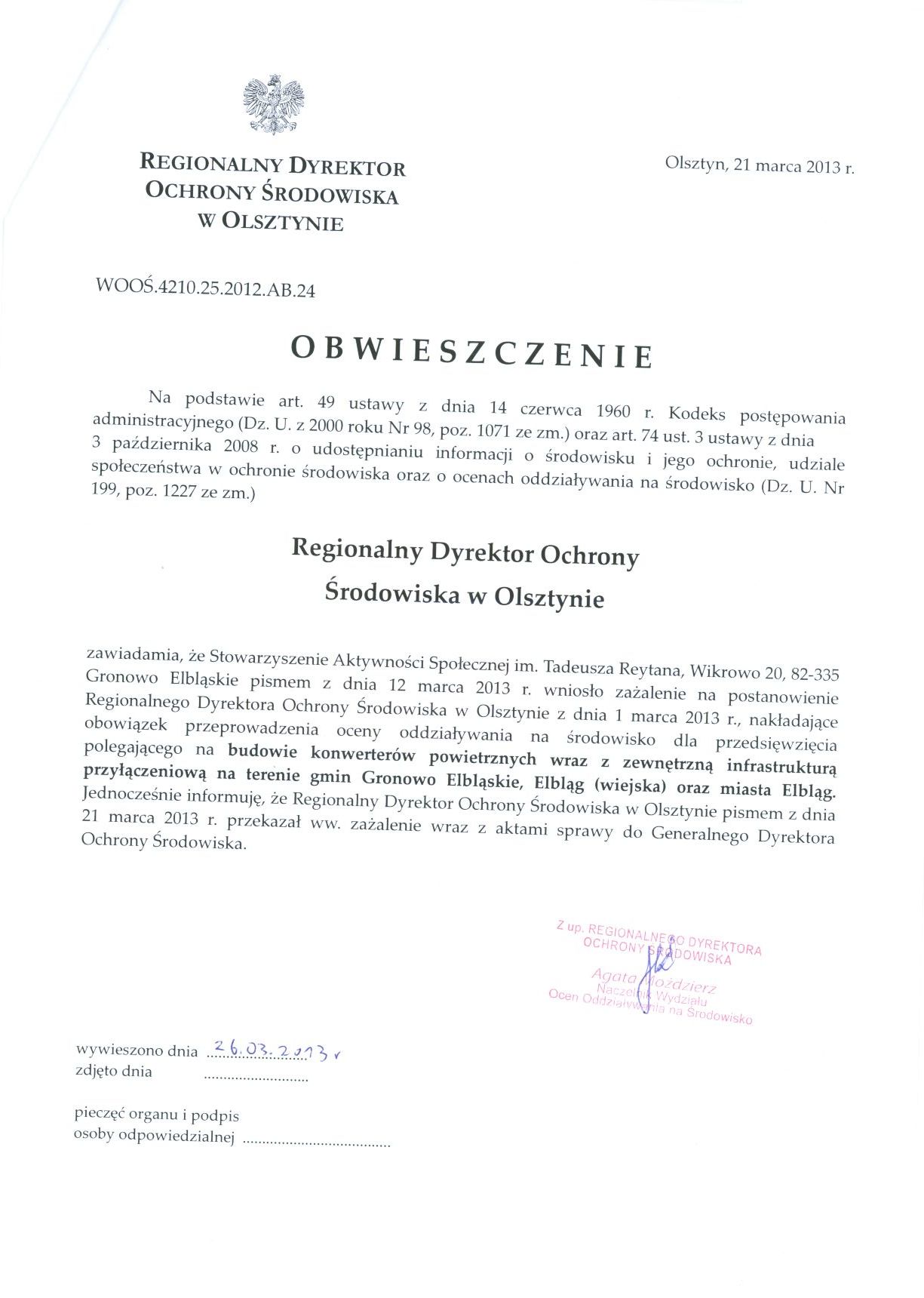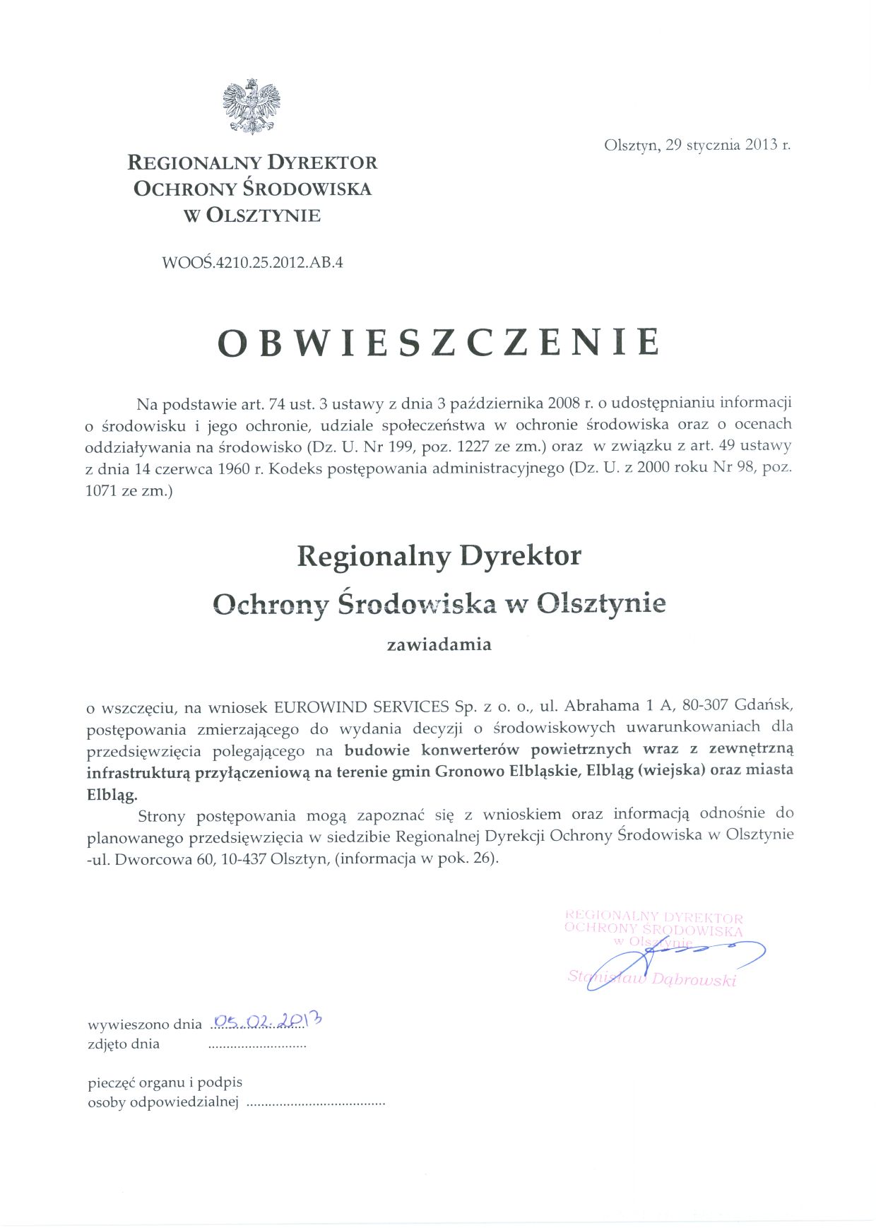 Obwieszczenie Regionalnego Dyrektora Ochrony Środowiska w Olsztynie o wszczęciu postępowania dot. wydania decyzji o środowiskowych uwarunkowaniach dla przedsięwzięcia polegającego na "budowie konwerterów powietrznych wraz z zewnętrzną infrastrukturą przyłączeniową na terenie gminy Gronowo Elbląskie, Elbląg (wiejska) oraz miasta Elbląg"