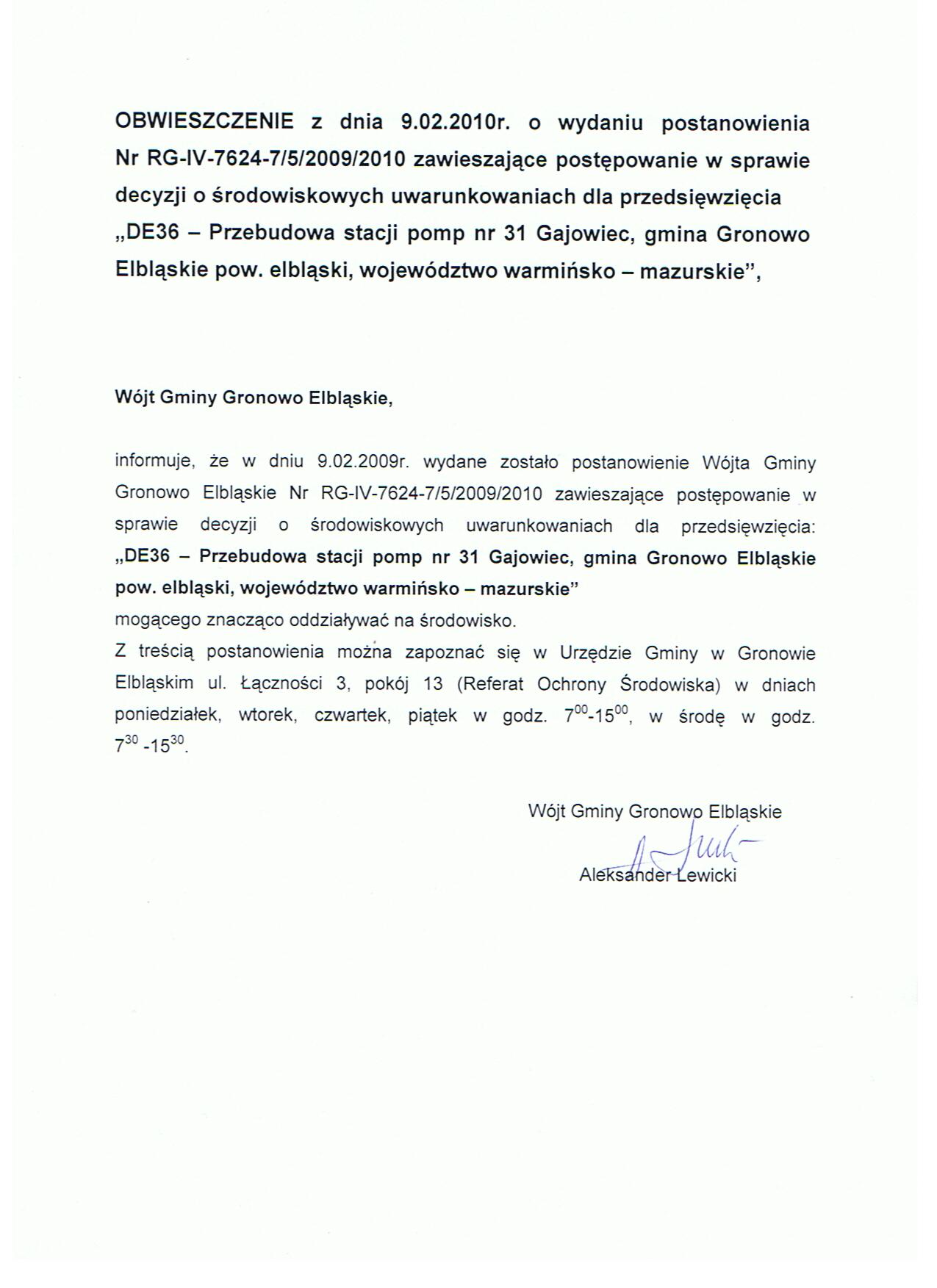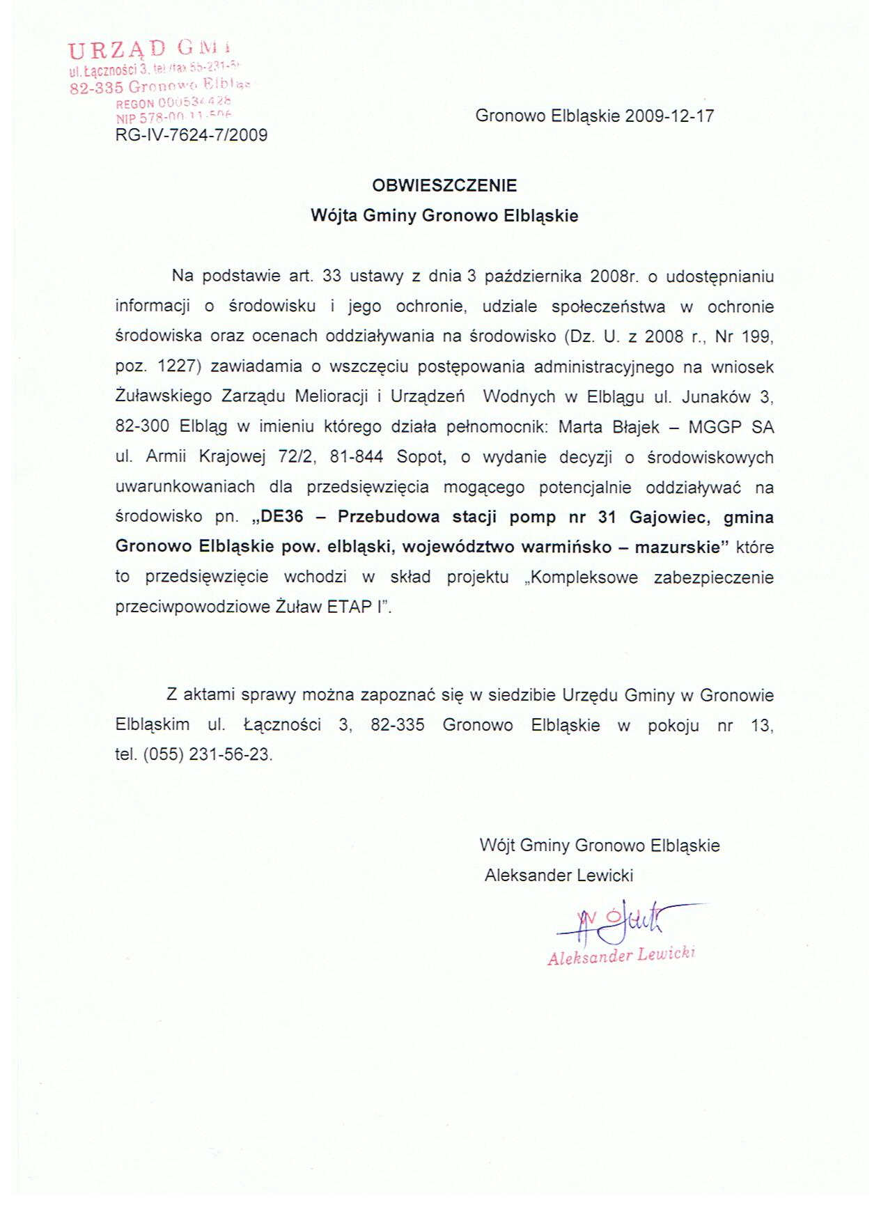 Obwieszcz. Wójta_przebud. stacji pomp nr 31_Gajewiec_17.12.2009