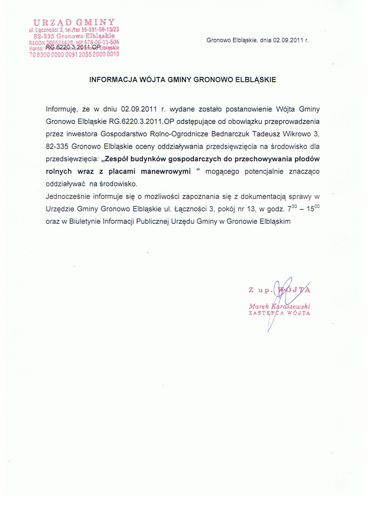 Informacja Wójta Gminy z dnia 2 września 2011 r.