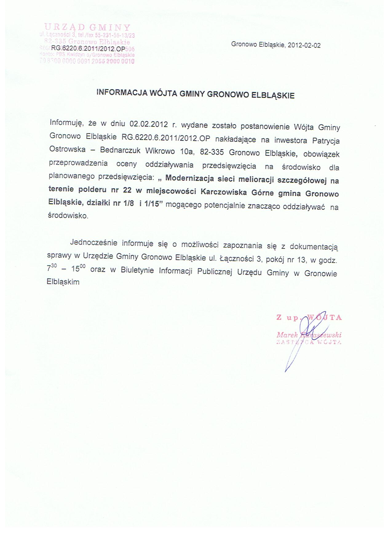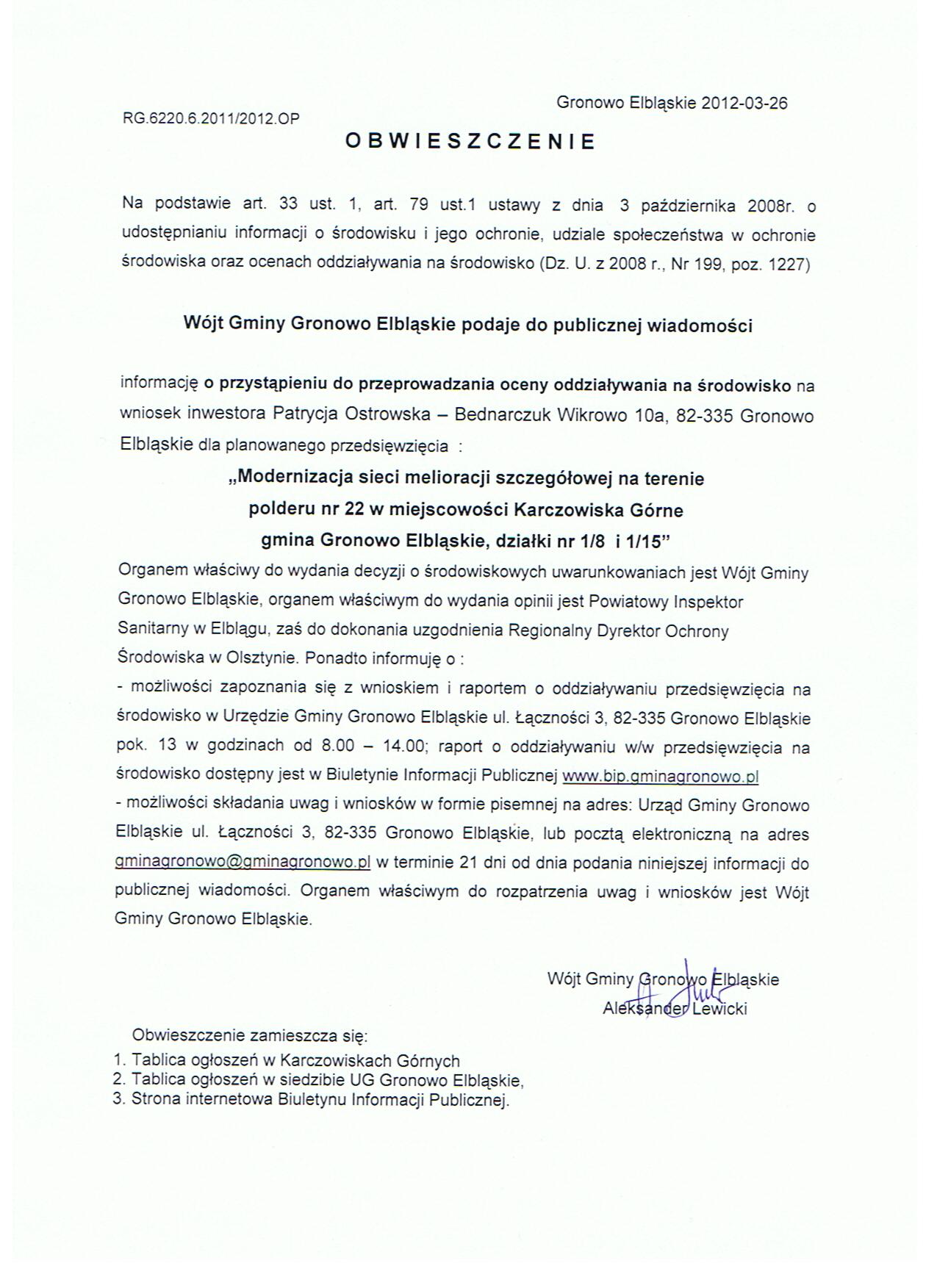 Przedsięwzięcie pod nazwą "Modernizacja sieci melioracji szczegółowej na terenie polderu nr 22 w miejscowości Karczowiska Górne Gmina Gronowo Elbląskie, działki nr 1/8 i 1/15"