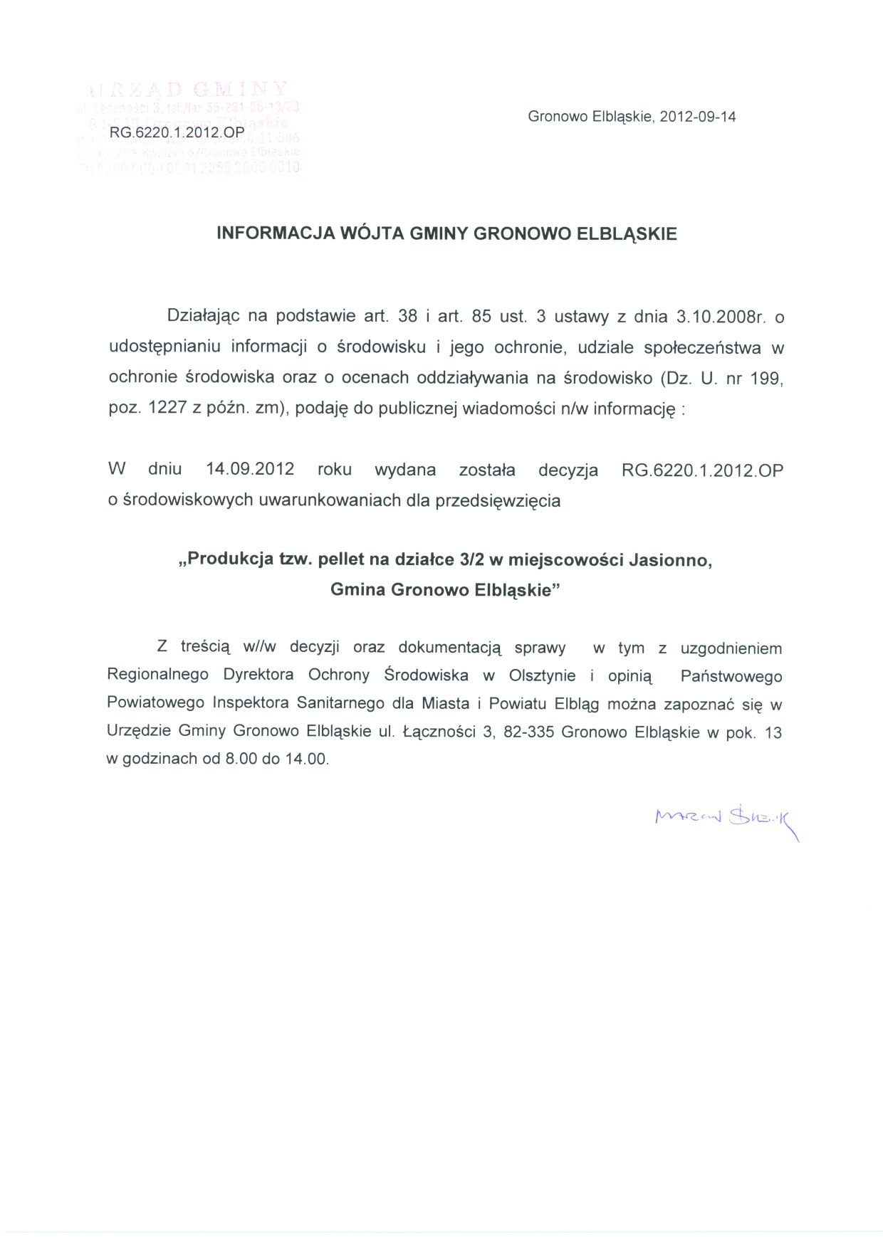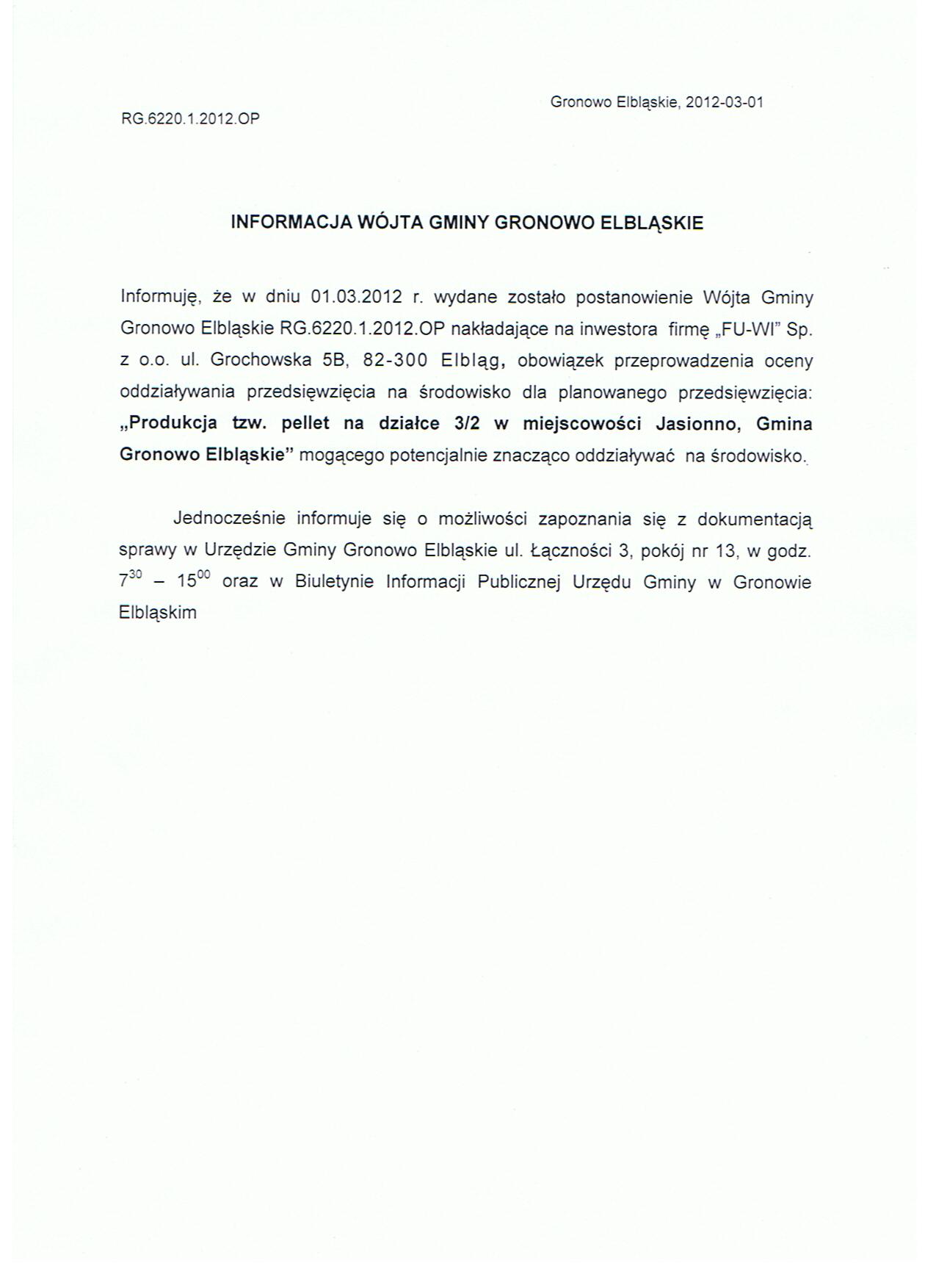 Informacja Wójta Gminy z dnia 01.03.2012 o wydanym postanowieniu
