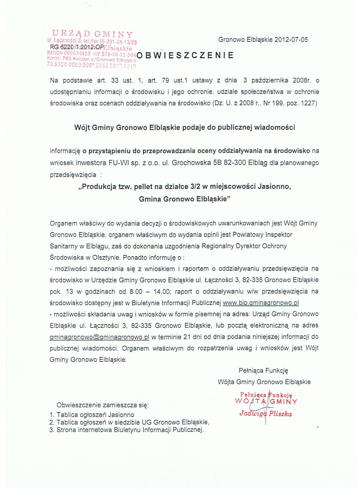 Przedsięwzięcie pod nazwą "Produkcja tzw. pellet na działce 3/2 w miejscowości Jasionno, Gmina Gronowo Elbląskie"