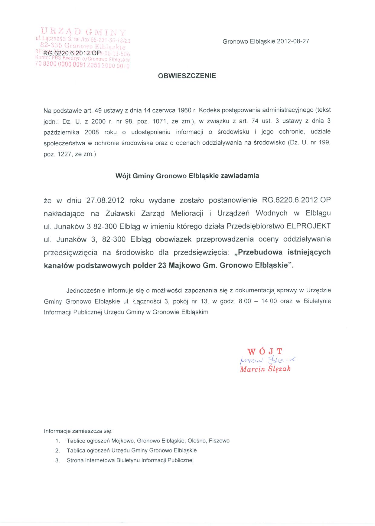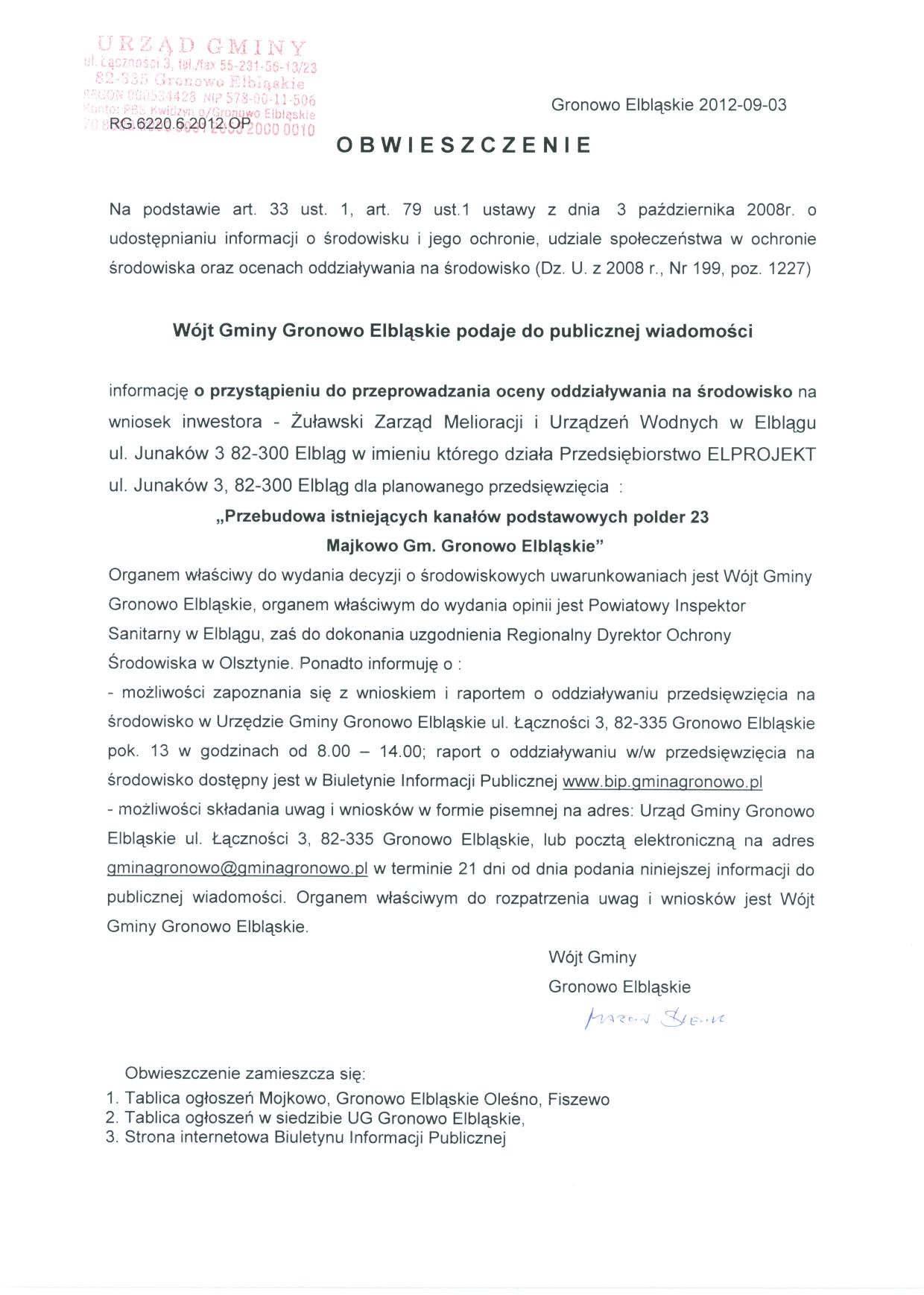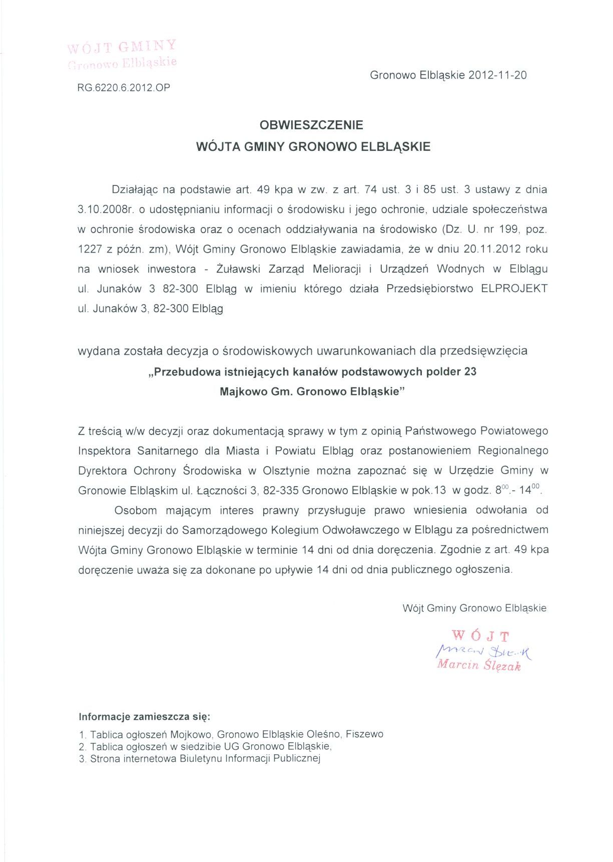 - Obwieszczenie Wójta Gminy Gronowo Elbląskie z dnia 20 listopada 2012 roku