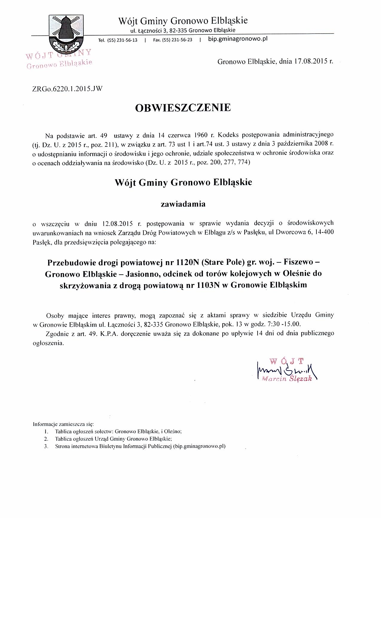 Przedsięwzięcie pod nazwą "Przebudowa drogi powiatowej nr 1120N (Stare Pole) gr woj.- Fiszewo - Gronowo Elbląskie - Jasionno, odcinek od torów kolejowych w Oleśnie do skrzyżowania z drogą powiatową nr 1103N w Gronowie Elbląskim"