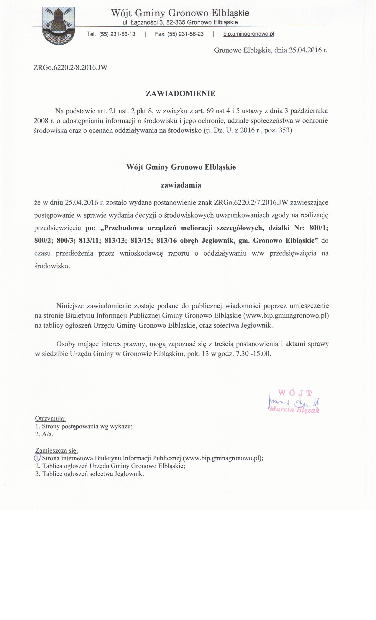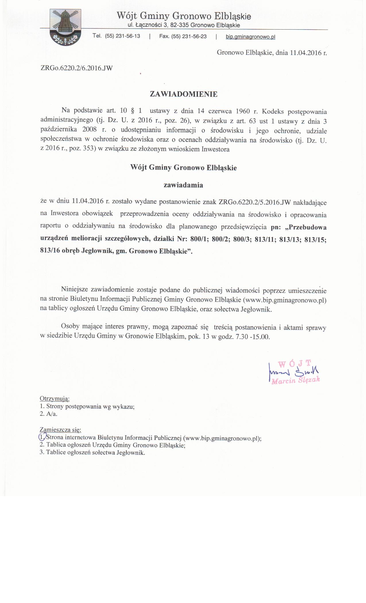 Przedsięwzięcie pod nazwą "Przebudowa urządzeń melioracji szczegółowych, działki Nr: 800/1; 800/2; 800/3; 813/11; 813/13; 813/15; 813/16 obręb Jegłownik, Gm. Gronowo Elbląskie"