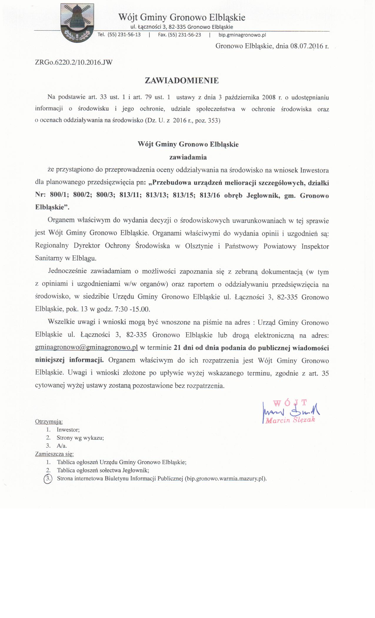 zawiadomienie z dnia 08.07.2016 r. o przystąpieniu do przeprowadzenia oceny oddziaływania na środowisko