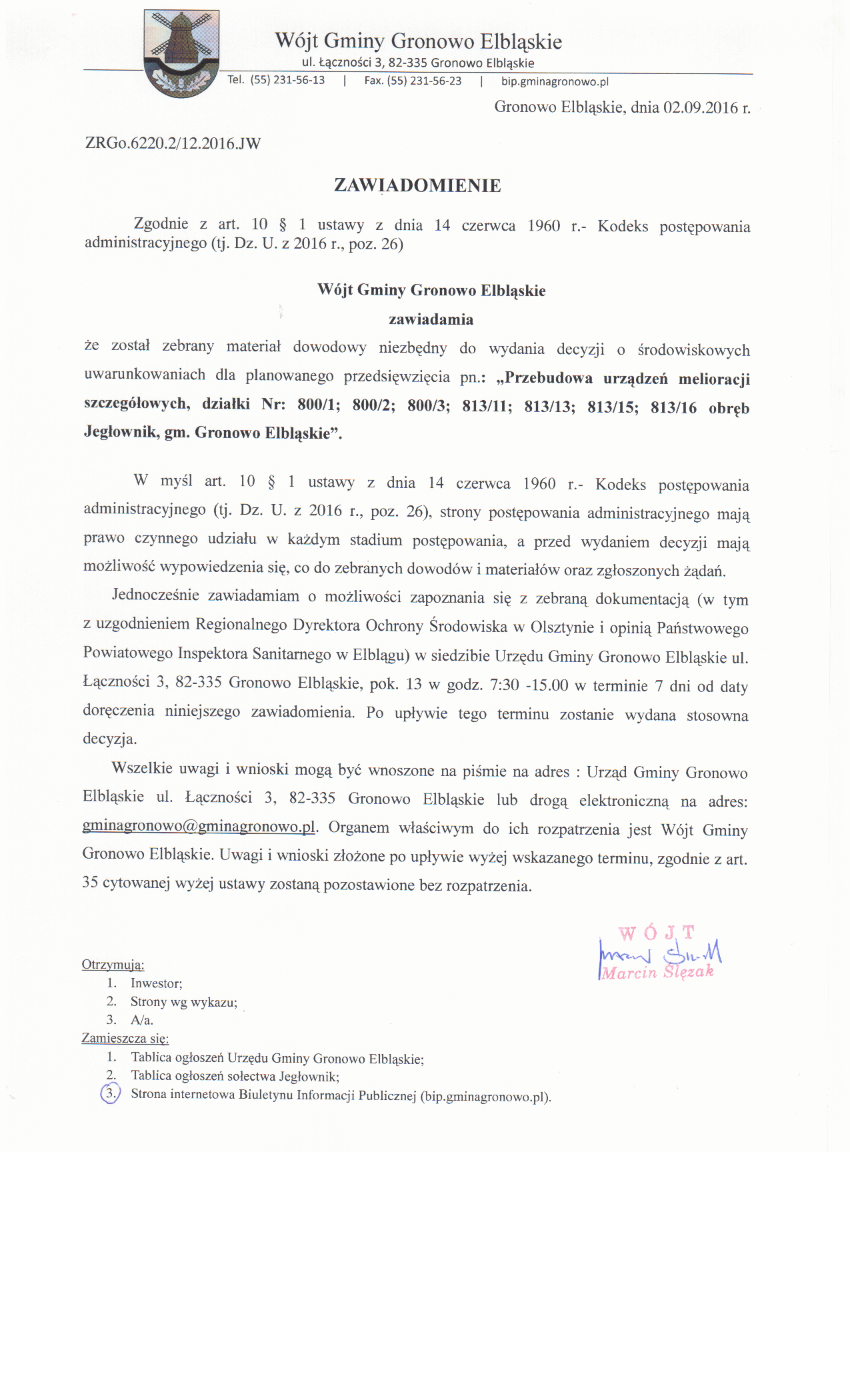 Przedsięwzięcie pod nazwą "Przebudowa urządzeń melioracji szczegółowych, działki Nr: 800/1; 800/2; 800/3; 813/11; 813/13; 813/15; 813/16 obręb Jegłownik, Gm. Gronowo Elbląskie"