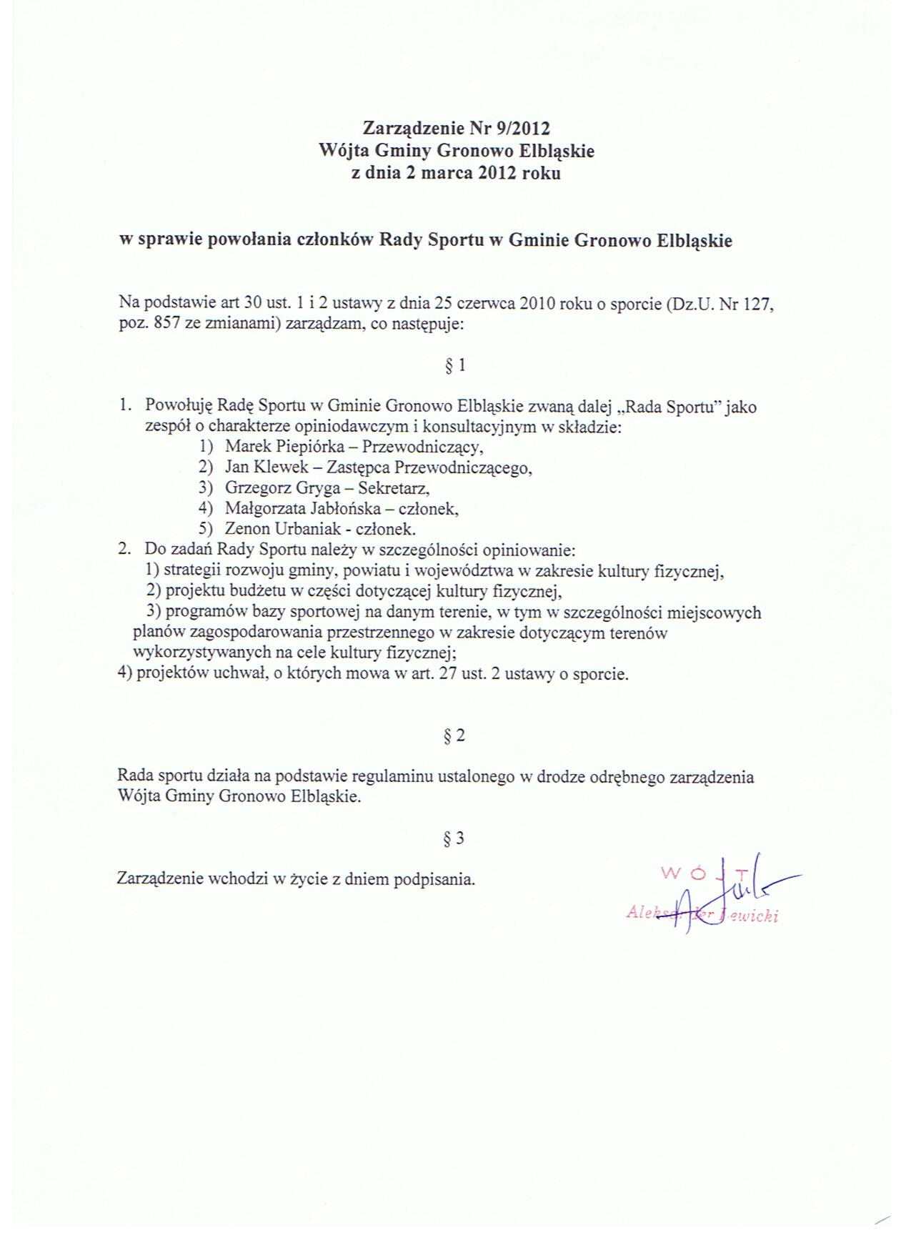 - Zarządzenie Nr 9/12 Wójta Gminy Gronowo Elbląskie z dnia 3 marca 2012 roku w sprawie powoływania członków Rady Sportu w Gminie Gronowo Elbląskie