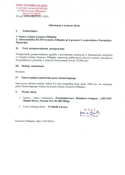 Wersja obowiązująca z dnia 15-07-2016 08:38:38 Drukuj Informacja o wyborze oferty - dostawa piasku Załączniki informacja o wyborze oferty - piasek frakcji 0-2 mm (pospółka) format: image/jpeg, rozmiar: 291.37 KB, data dodania: 15-07-2016 08:35:38