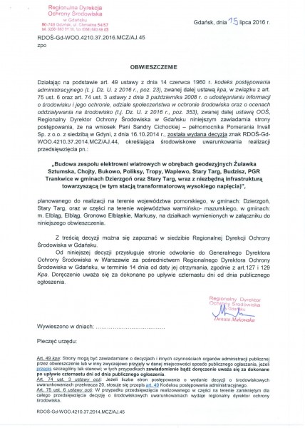 Obwieszczenie RDOŚ w Gdańsku dot. "budowy zespołu elektrowni wiatrowych w obrębach geodezyjnych Żuławka Sztumska, Chojty, Bukowo, Poliksy, Tropy, Waplewo, Stary Targ, Budzisz, PGR Trankowice w gminach Dzierzgoń oraz Stary Targ, wraz z niezbędną infrastrukturą towarzyszącą..." z dnia 15 lipca 2016r