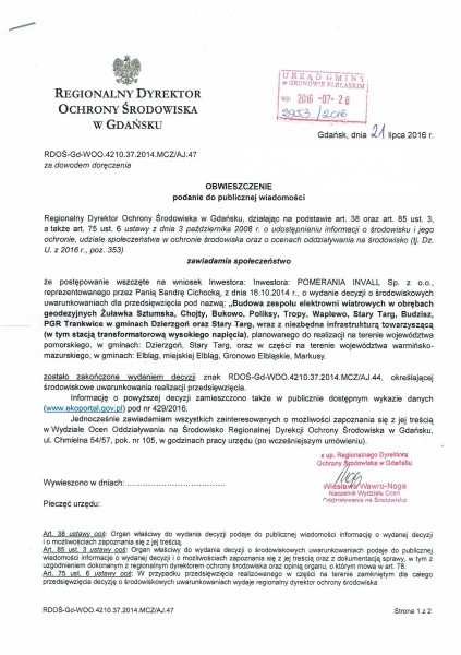 Obwieszczenie RDOŚ w Gdańsku dot. "budowy zespołu elektrowni wiatrowych w obrębach geodezyjnych Żuławka Sztumska, Chojty, Bukowo, Poliksy, Tropy, Waplewo, Stary Targ, Budzisz, PGR Trankowice w gminach Dzierzgoń oraz Stary Targ, wraz z niezbędną infrastrukturą towarzyszącą..." z dnia 21 lipca 2016r