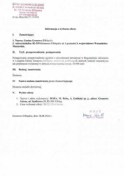 Wersja obowiązująca z dnia 23-08-2016 09:52:06 Drukuj Informacja o wyborze oferty - dostawa stolarki drzwiowej Załączniki informacja o wyborze oferty - dostawa stolarki drzwiowej format: image/jpeg, rozmiar: 212.41 KB, data dodania: 23-08-2016 09:52:06