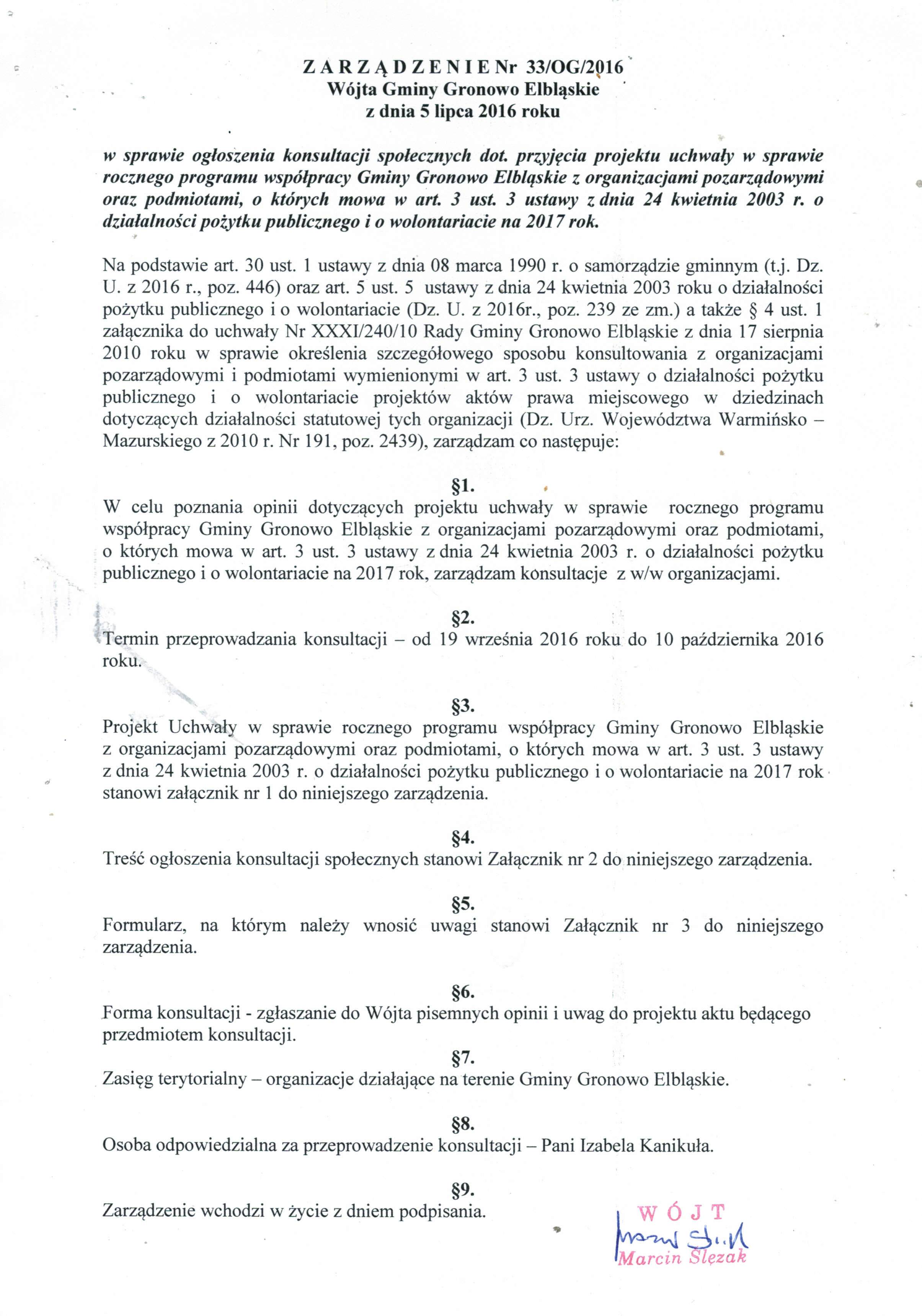 Zarządzenie Nr 33/OG/2016 Wójta Gminy Gronowo Elbląskie z dnia 5 lipca 2016 roku