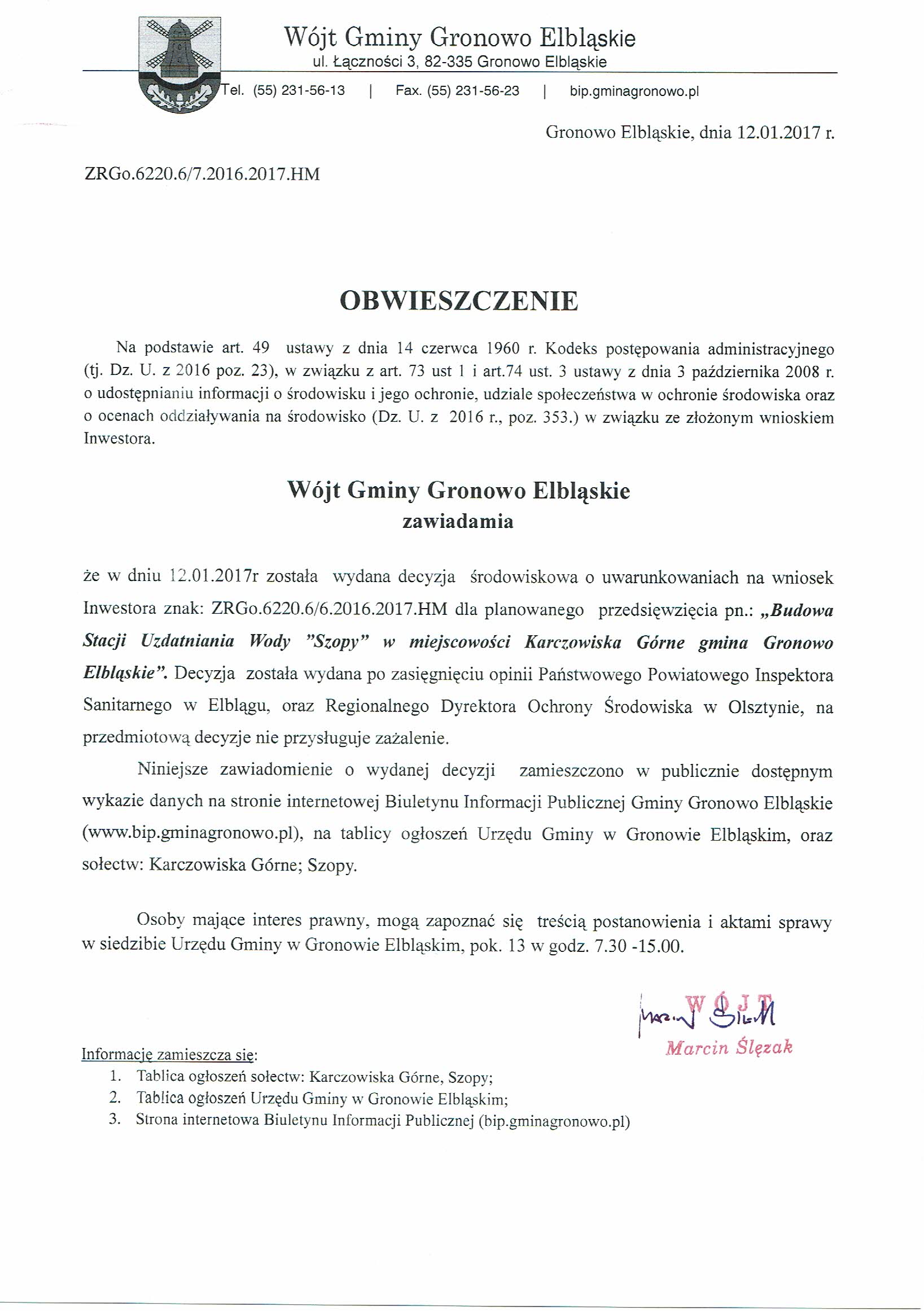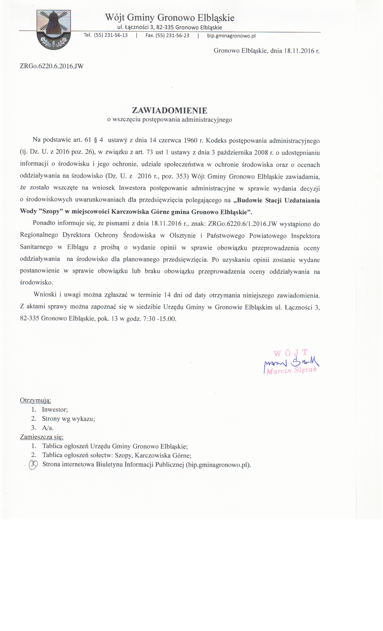 Postępowanie w sprawie wydania decyzji o środowiskowych uwarunkowaniach dla przedsięwzięcia polegającego na Budowie Stacji Uzdatniania Wody "Szopy" w miejscowości Karczowiska Górne gmina Gronowo Elbląskie.