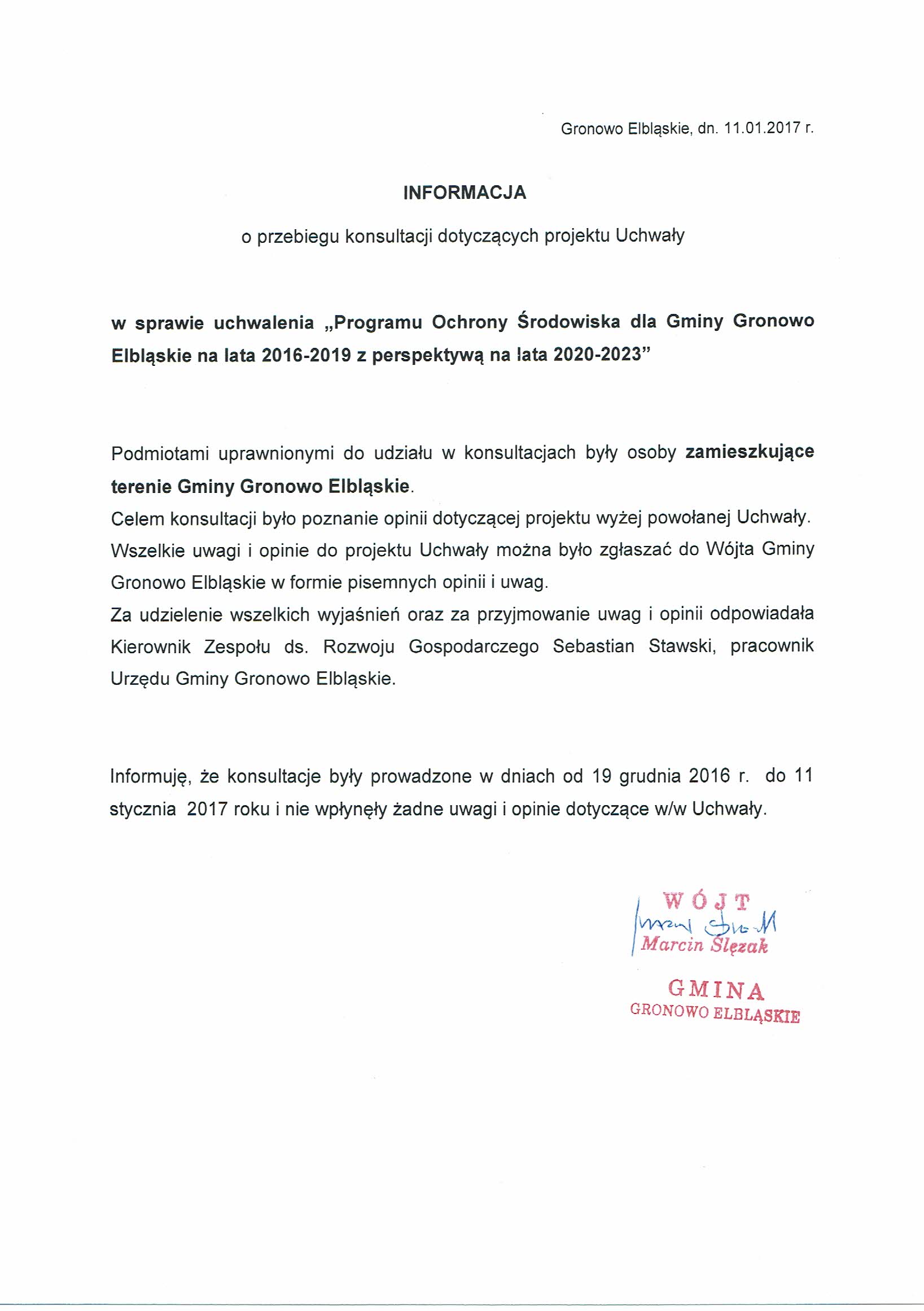 Zgodnie z Zarządzeniem Nr 64/OG/2016 Wójta Gminy Gronowo Elbląskie z dnia 16 grudnia 2016 roku Wójt Gminy Gronowo Elbląskie zaprasza mieszkańców Gminy Gronowo Elbląskie do wzięcia udziału w konsultacjach społecznych projektu Programu Ochrony Środowiska dla Gminy Gronowo Elbląskie na lata 2016-2019, z perspektywą na lata 2020-2023".