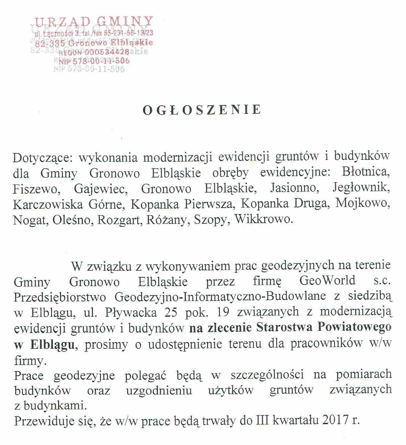 Wersja obowiązująca z dnia 16-12-2016 14:58:43 Drukuj Ogłoszenie o wykonywanych pracach geodezyjnych Załączniki Ogłoszenie o pracach geodezyjnych format: image/jpeg, rozmiar: 253.58 KB, data dodania: 16-12-2016 14:58:43