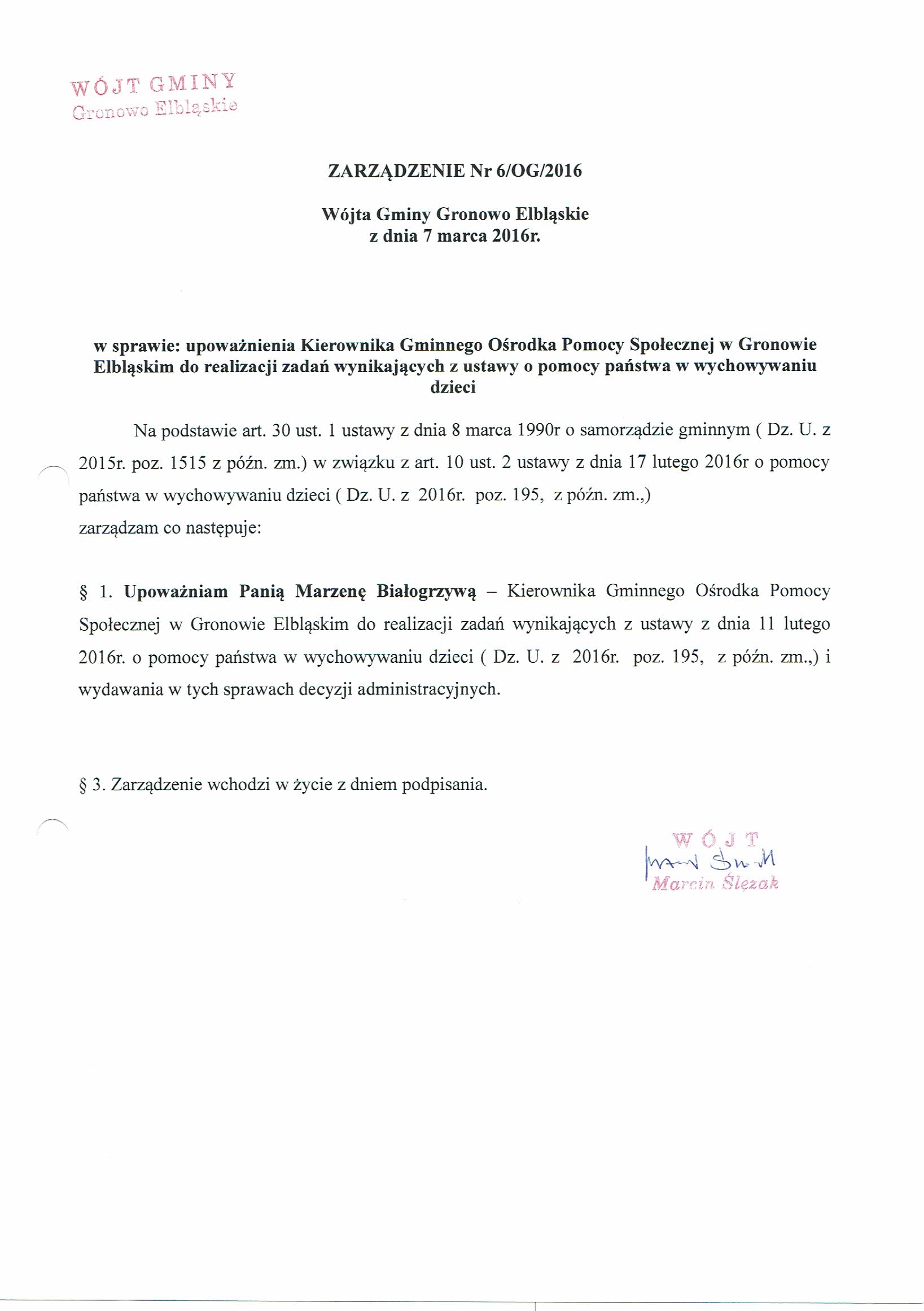 Zarządzenie Nr 6/OG/2016 Wójta Gminy Gronowo Elbląskie z dnia 7 marca 2016r. w sprawie: upoważnienia Kierownika Gminnego Ośrodka Pomocy Społecznej w Gronowie Elbląskim do realizacji zadań wynikających z ustawy o pomocy państwa w wychowywaniu dzieci
