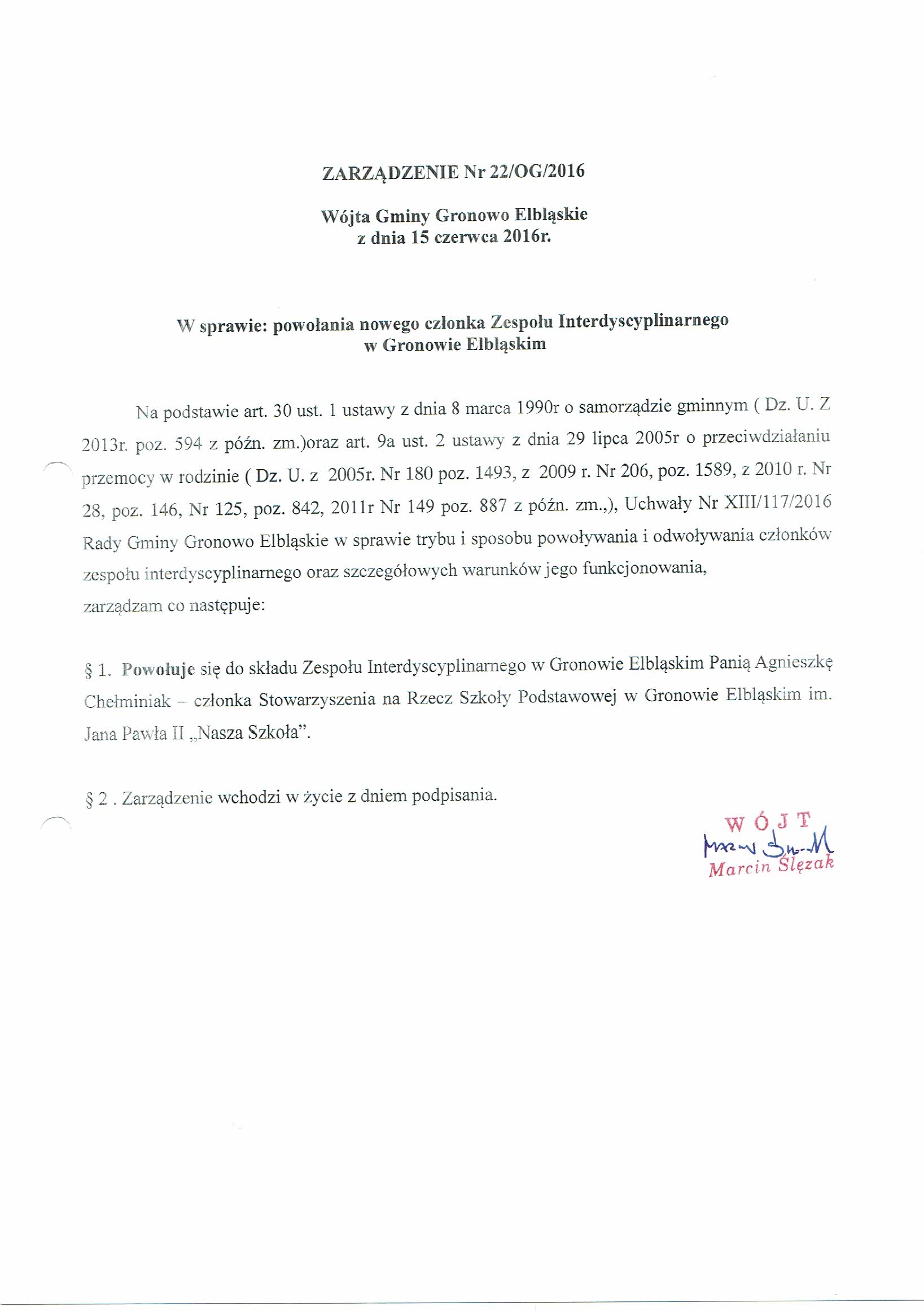 Zarządzenie Nr 22/OG/2016 Wójta Gminy Gronowo Elbląskie z dnia 15 czerwca 2016r. w sprawie: powołania nowego członka Zespołu Interdyscyplinarnego w Gronowie Elbląskim