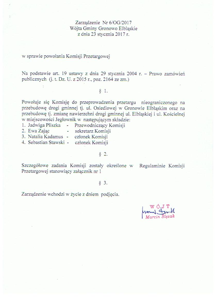 Zarządzenie Nr 6/OG/2017 Wójta Gminy Gronowo Elbląskie z dnia 23 stycznia 2017 r. w sprawie powołania Komisji Przetargowej