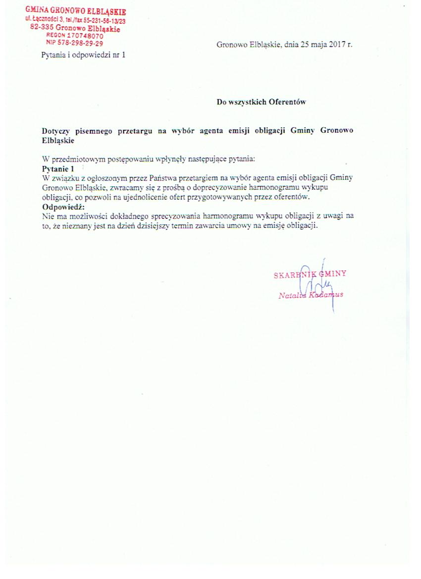 Ogłoszenie o pisemnym przetargu na wybór agenta emisji obligacji Gminy Gronowo Elbląskie