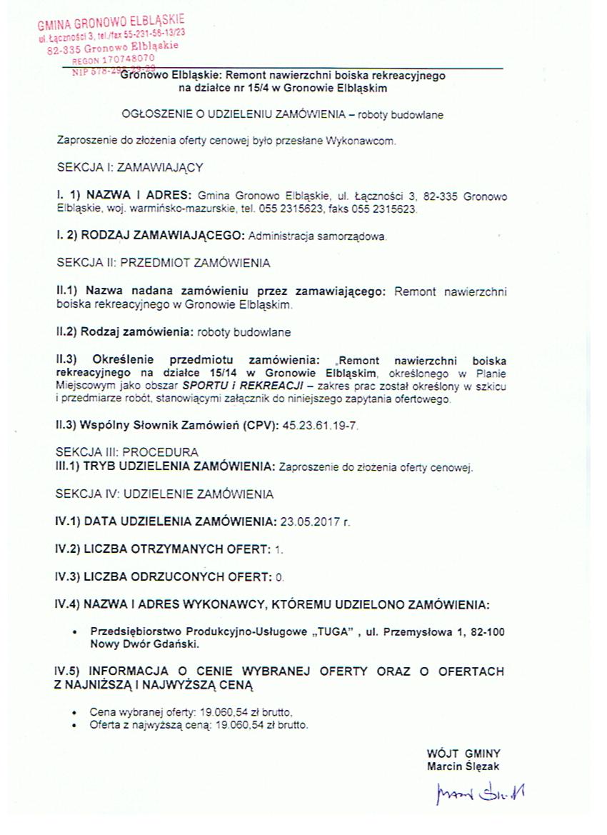 Informacja o wyborze oferty na remont nawierzchni boiska rekreacyjnego w Gronowie Elbląskim