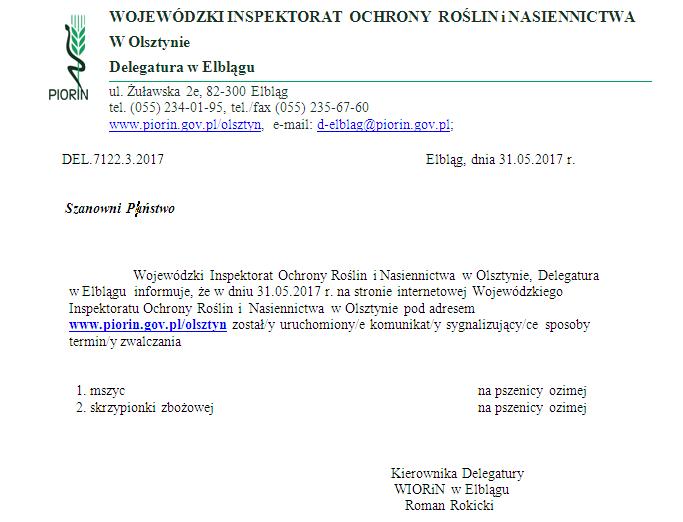 Wersja obowiązująca z dnia 31-05-2017 08:04:22 Drukuj Komunikat Wojewódzkiego Inspektoratu Ochrony Roślin i Nasiennictwa w Olsztynie z dnia 31.05.2017 r.