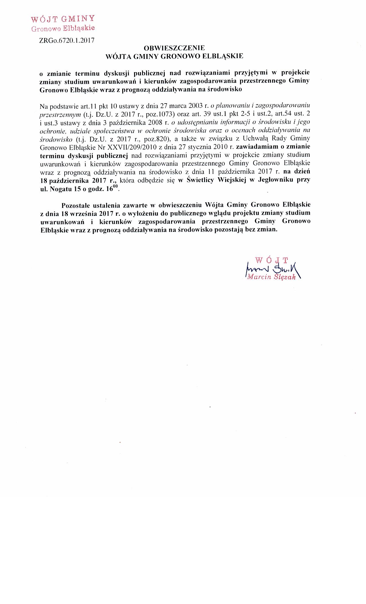 OBWIESZCZENIE WÓJTA GMINY GRONOWO ELBLĄSKIE o zmianie terminu dyskusji publicznej nad rozwiązaniami przyjętymi w projekcie zmiany studium uwarunkowań i kierunków zagospodarowania przestrzennego Gminy Gronowo Elbląskie wraz z prognozą oddziaływania na środowisko