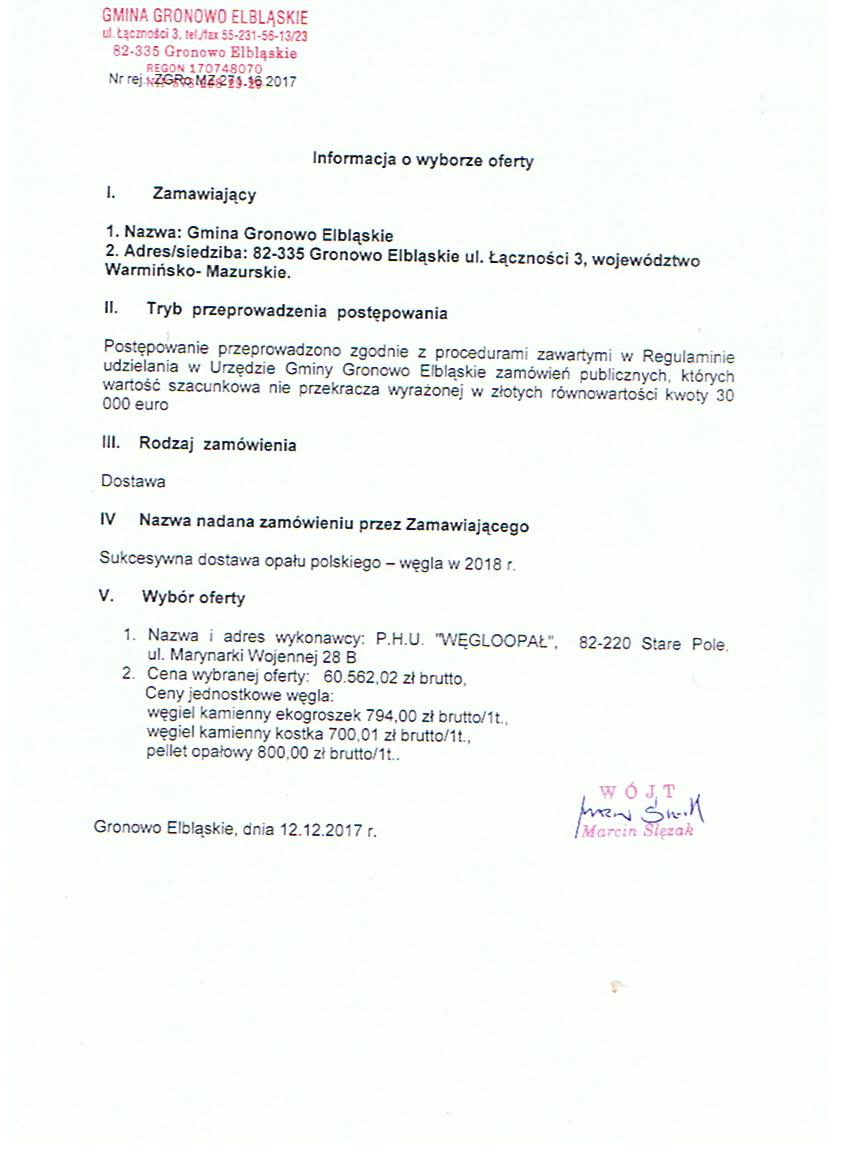 Wersja obowiązująca z dnia 12-12-2017 11:06:04 Drukuj Informacja o wyborze oferty na dostawę opału polskiego - węgla w 2018 r. Załączniki Informacja o wyborze oferty format: image/jpeg, rozmiar: 79.95 KB, data dodania: 12-12-2017 11:06:04