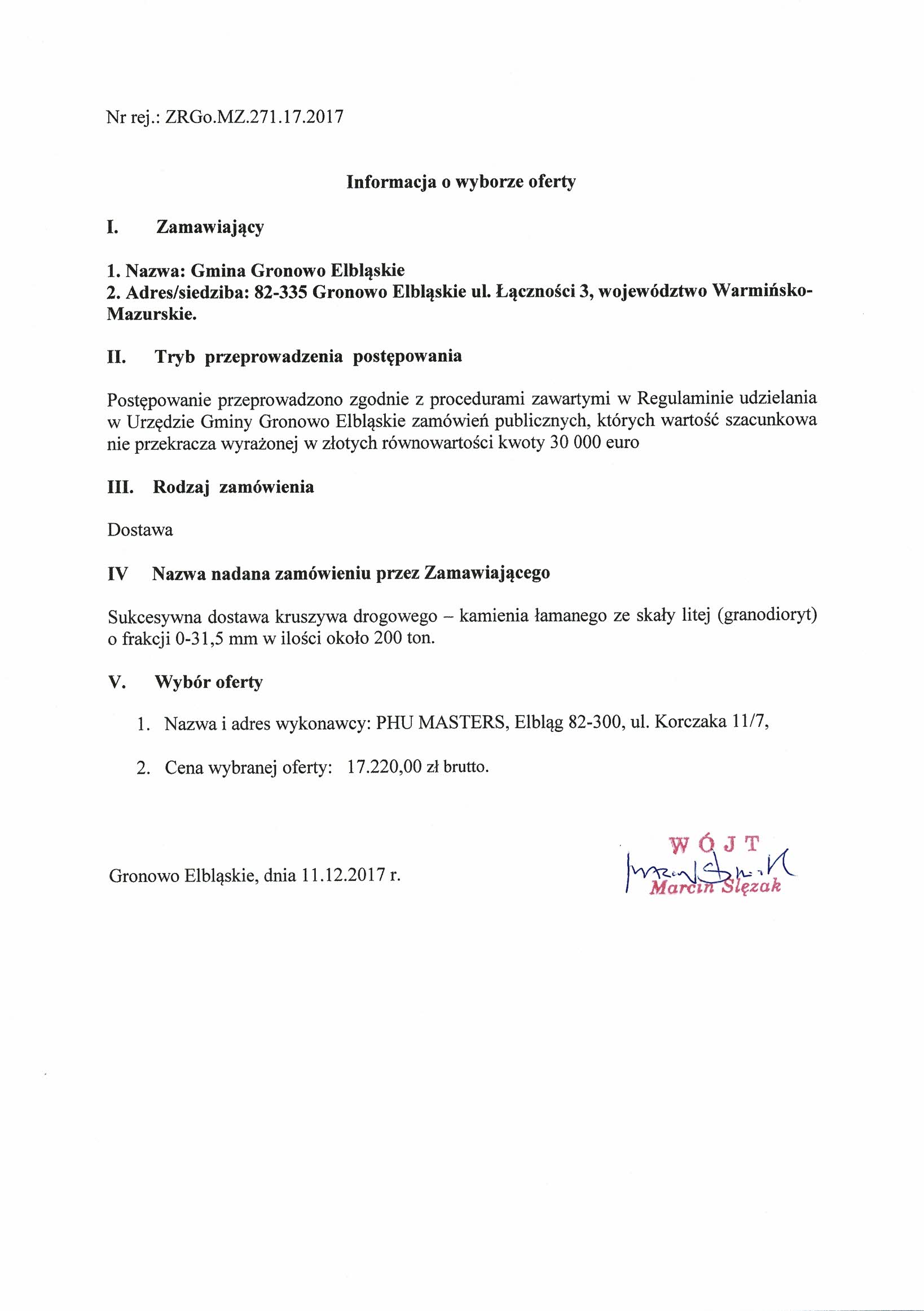 Ogłoszenie o udzieleniu zamówienia na dostawę kruszywa drogowego - kamienia drogowego ze skały litej o frakcji 0-31,5 mm w ilości około 200 ton