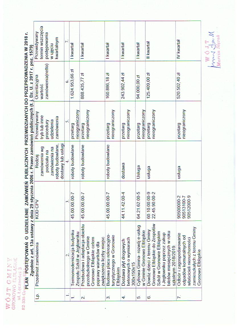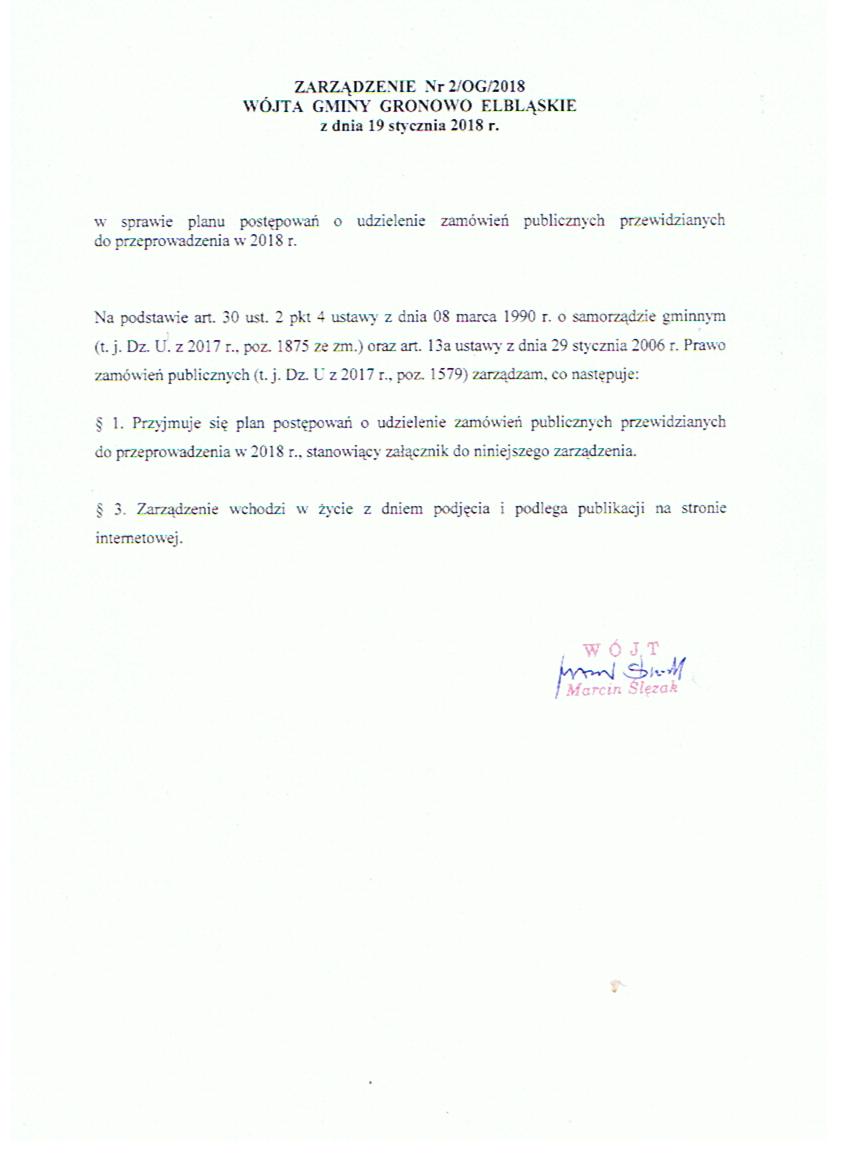 Zarządzenie Nr 2/OG/2018 Wójta Gminy Gronowo Elbląskie z dnia 19.01.2018 r. w sprawie planu postępowań o udzielenie zamówień publicznych przewidzianych do przeprowadzenia w 2018 r.