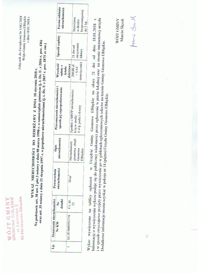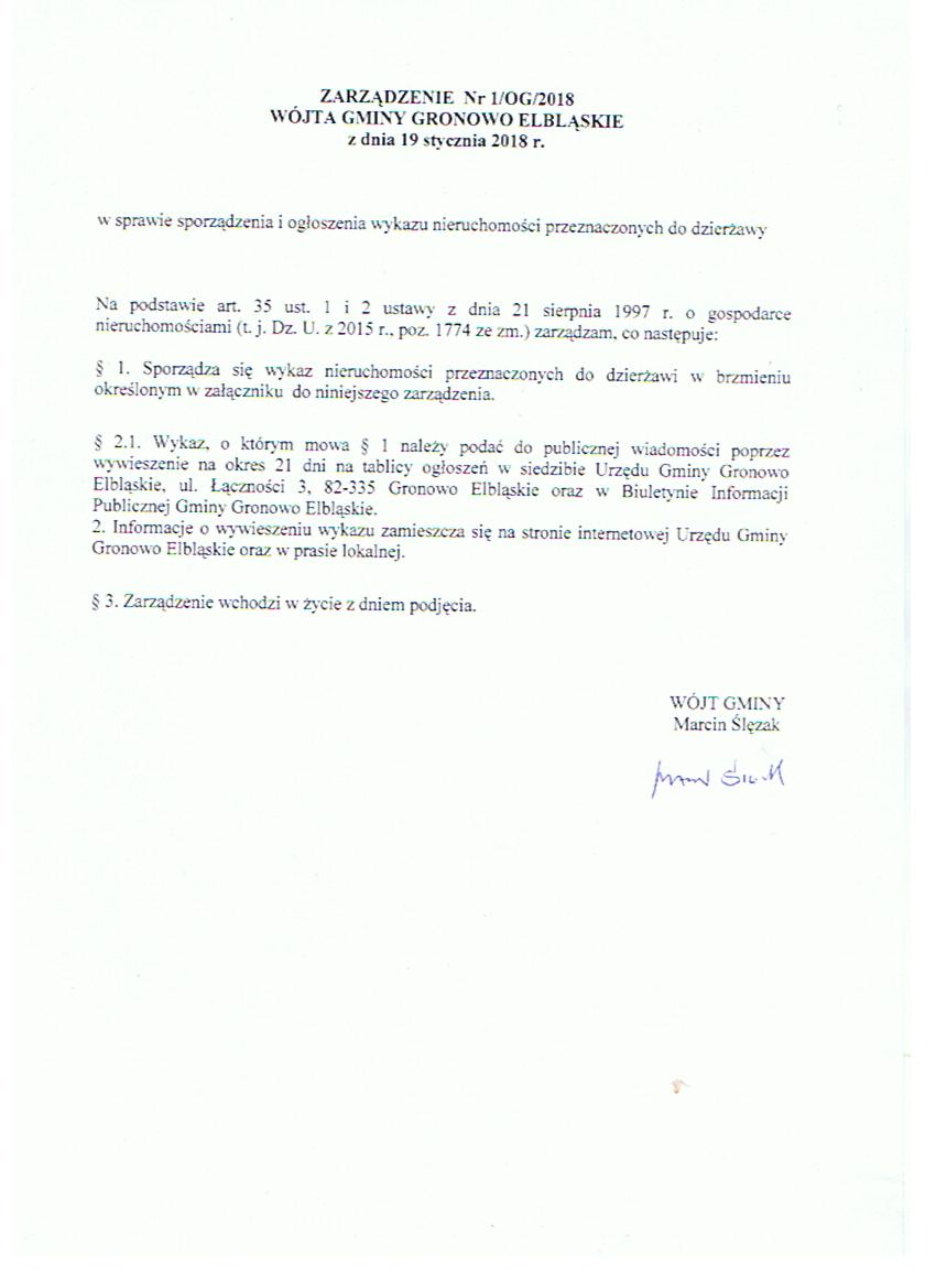 Zarządzenie Nr 1/OG/2018 Wójta Gminy Gronowo Elbląskie z dnia 19.01.2018 r. w sprawie sporządzenia i ogłoszenia wykazu nieruchomości przeznaczonych do dzierżawy